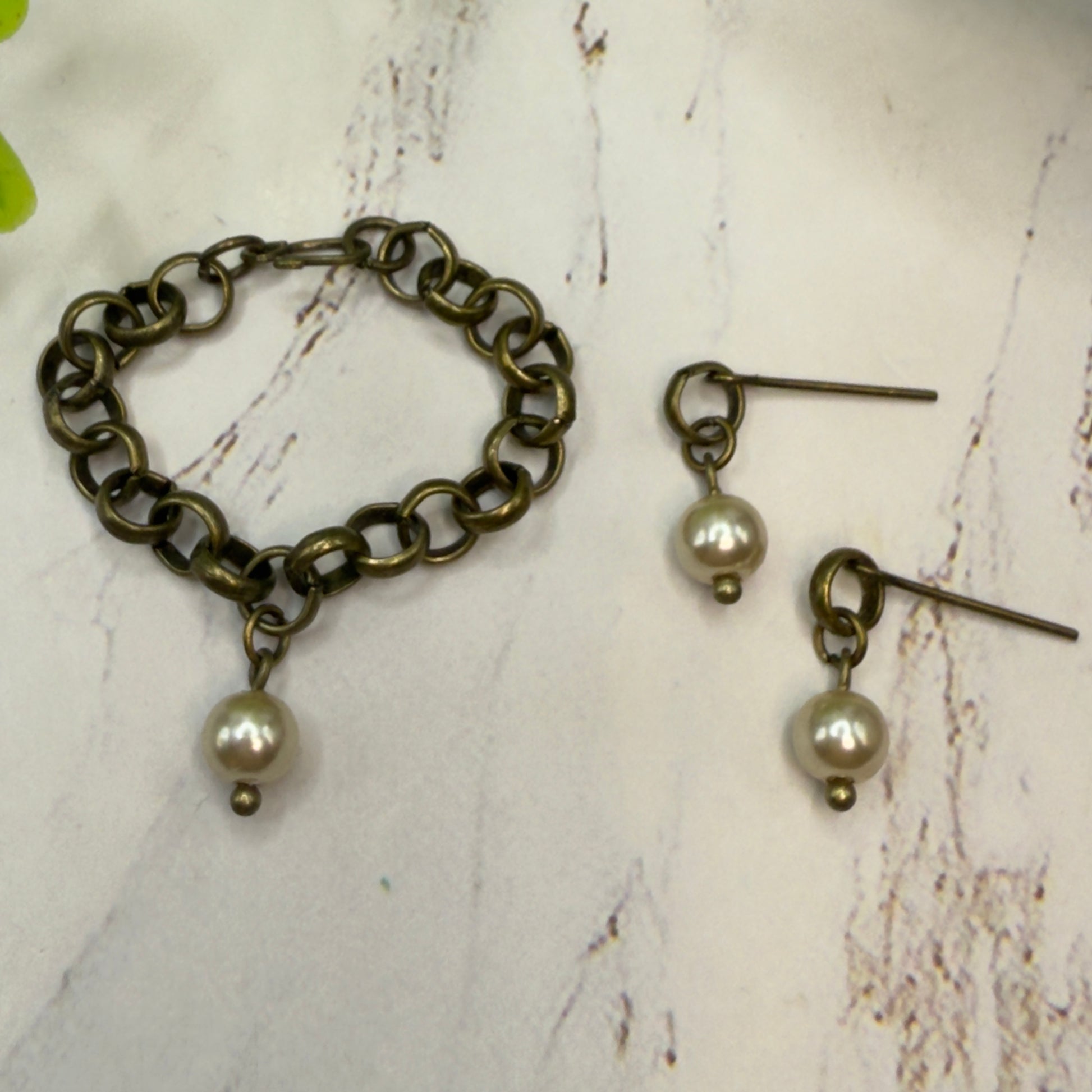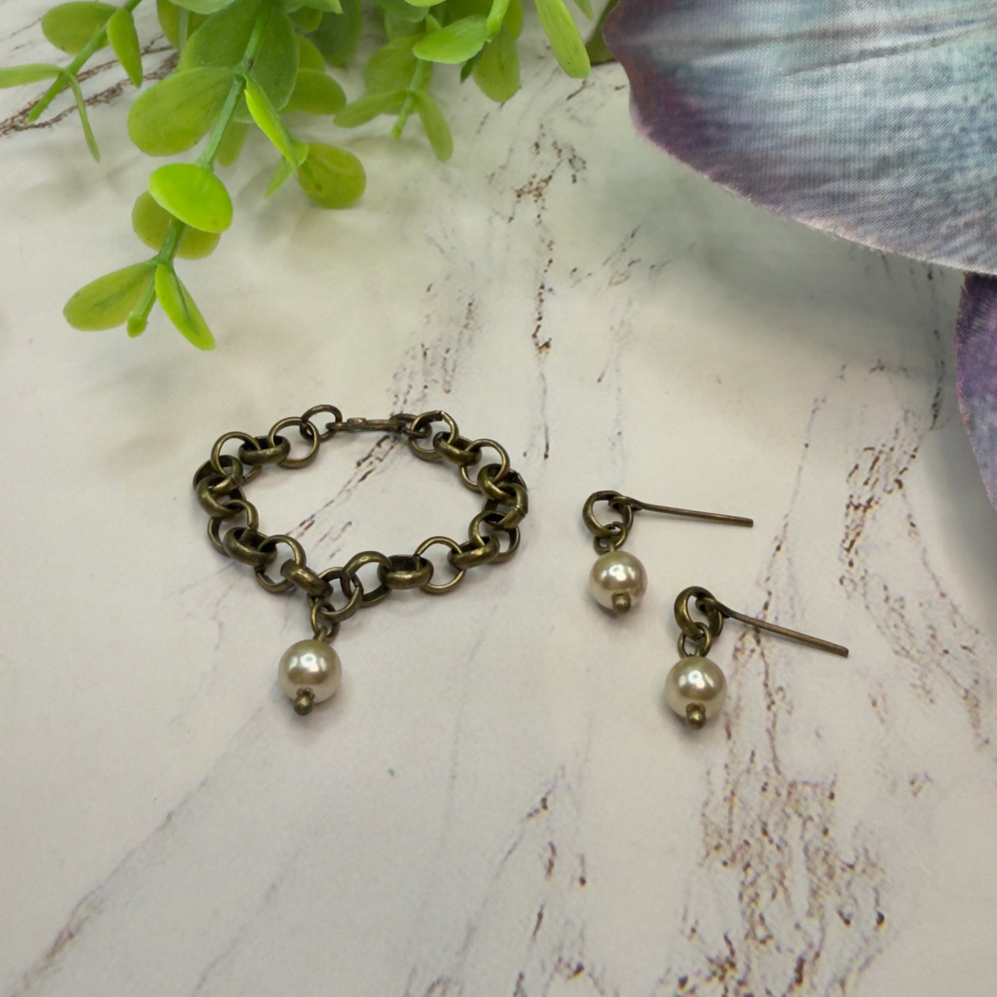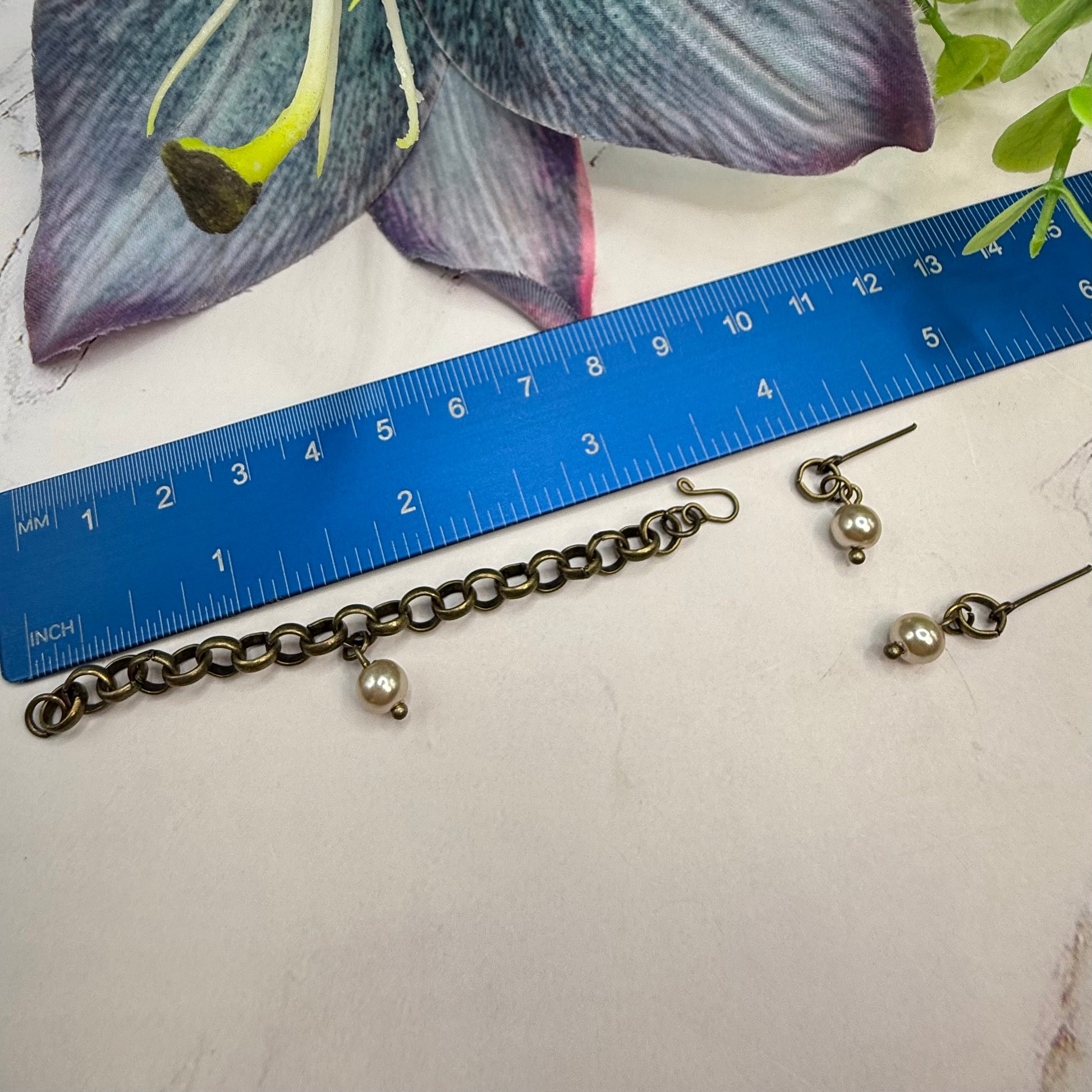 Brass Bronze Large Link Pearl Dangle Doll Necklace & Earrings Set • 16 Inch Fashion Doll Jewelry