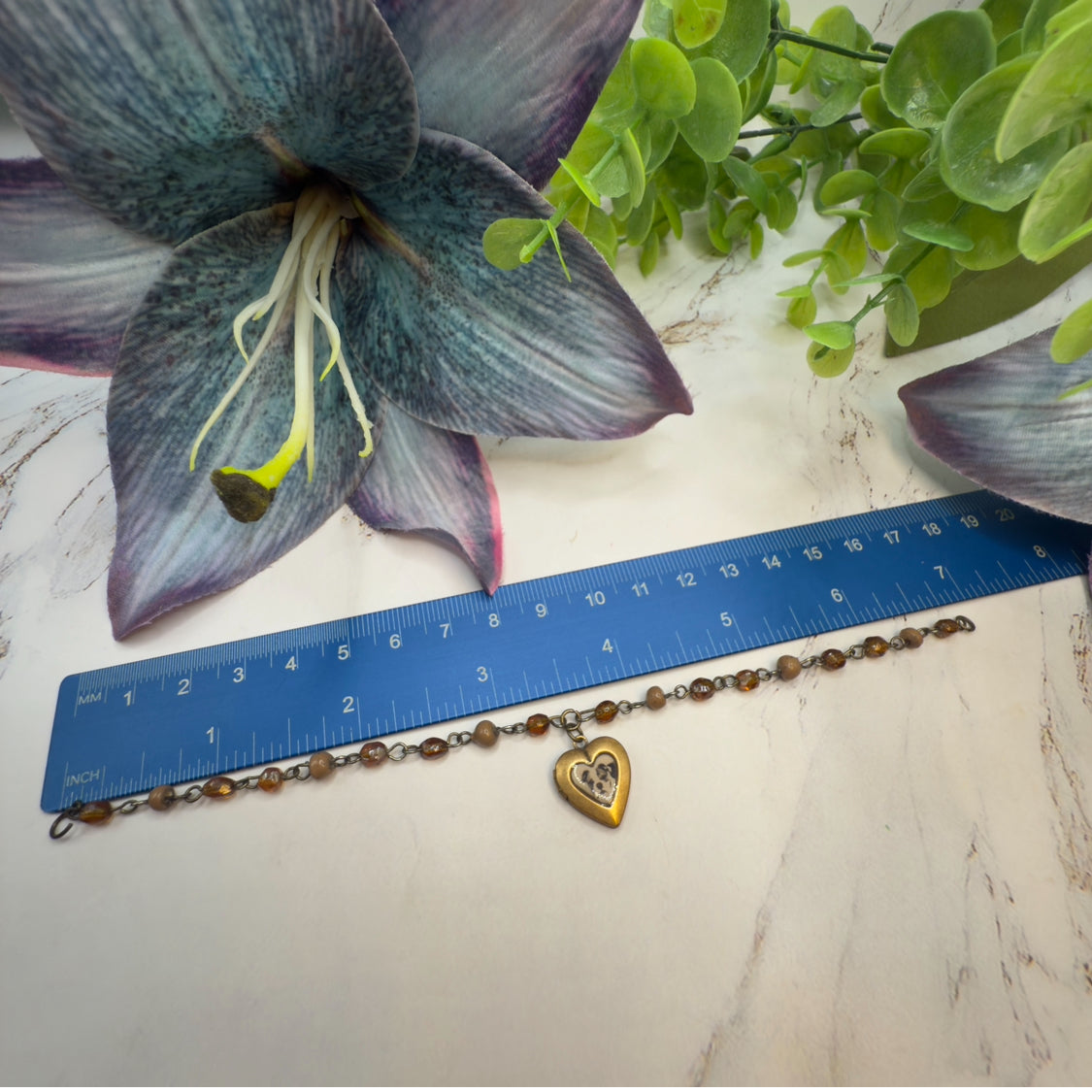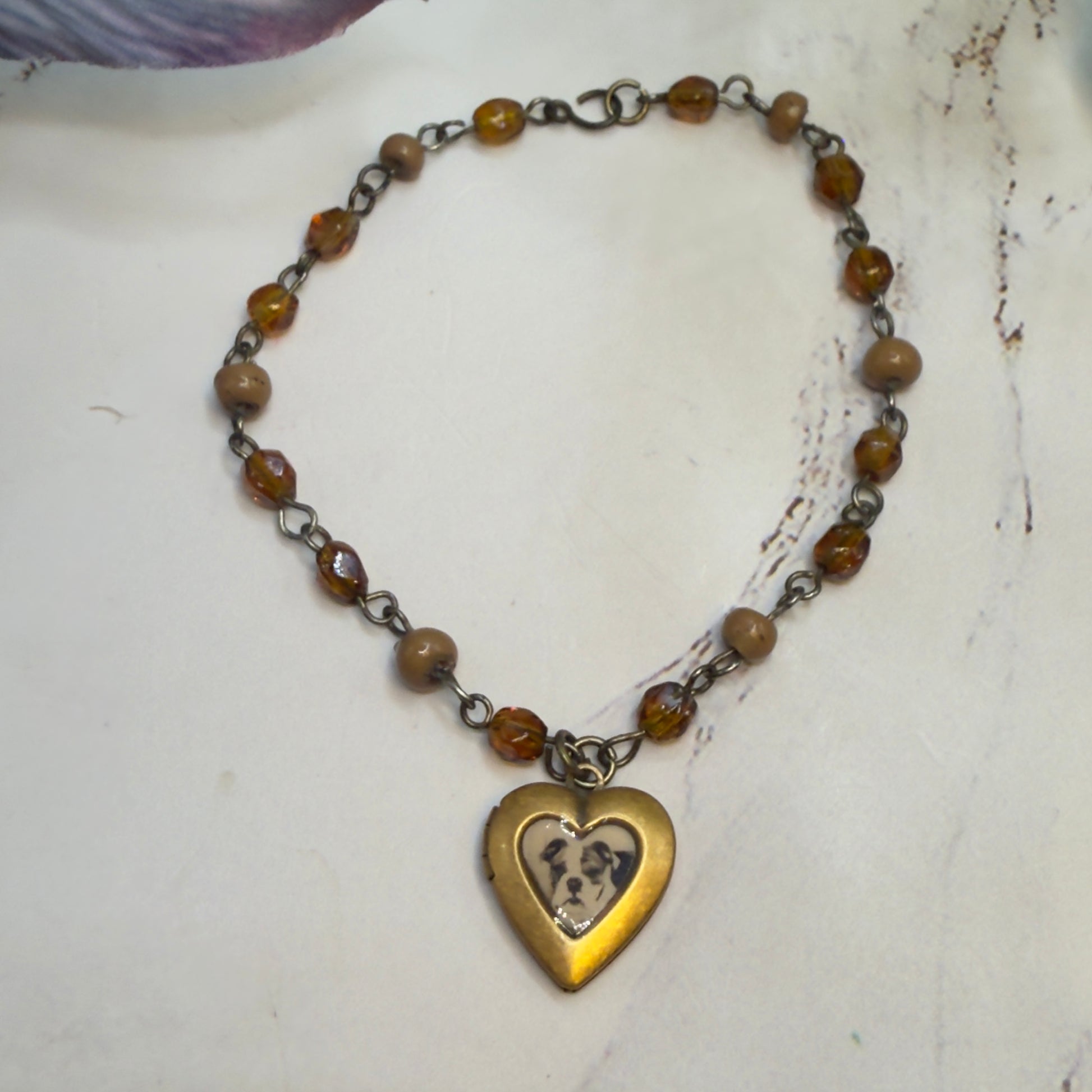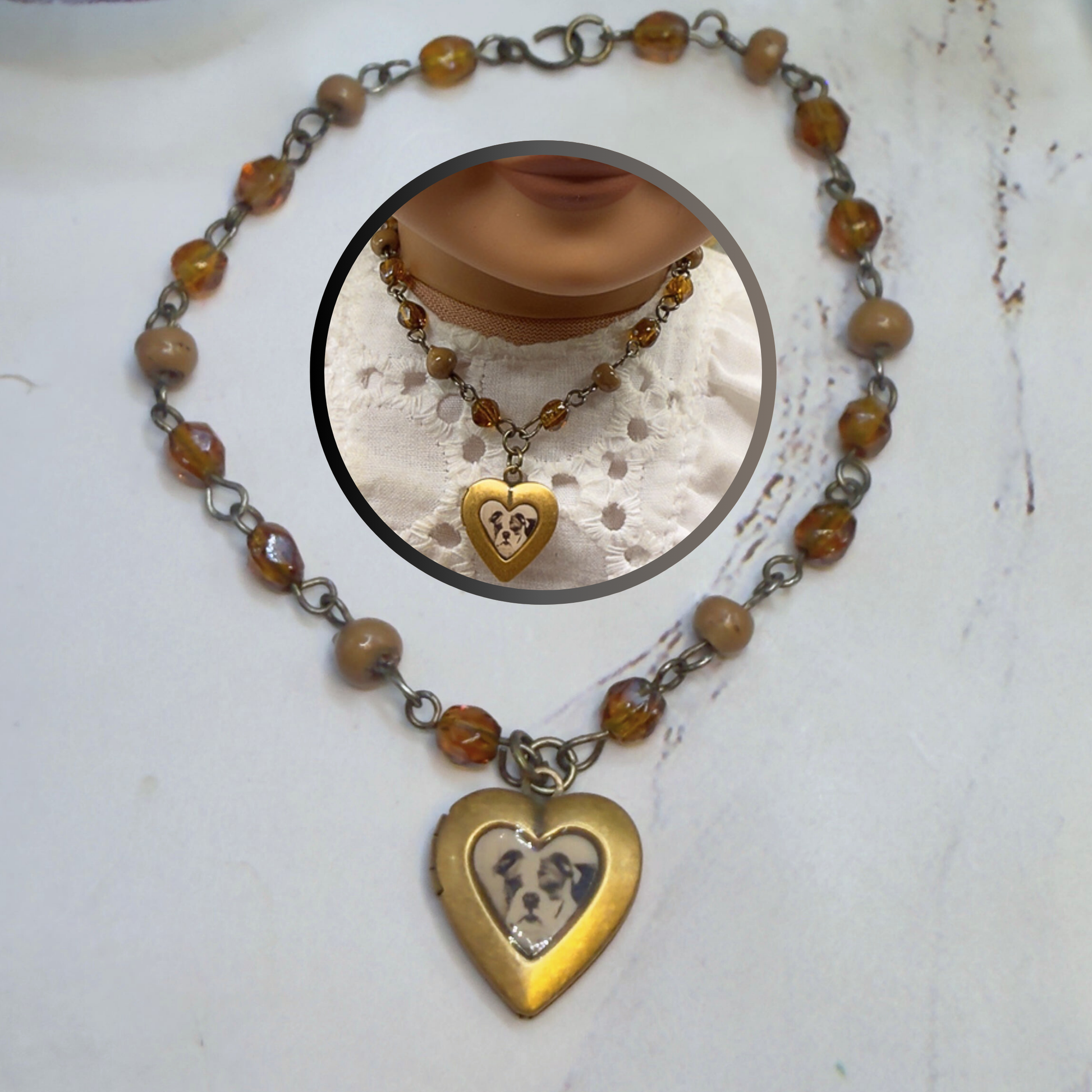 Dog Heart Locket Brown & Crystal Acrylic Beaded Doll Necklace. The necklace measures 7 inches long.