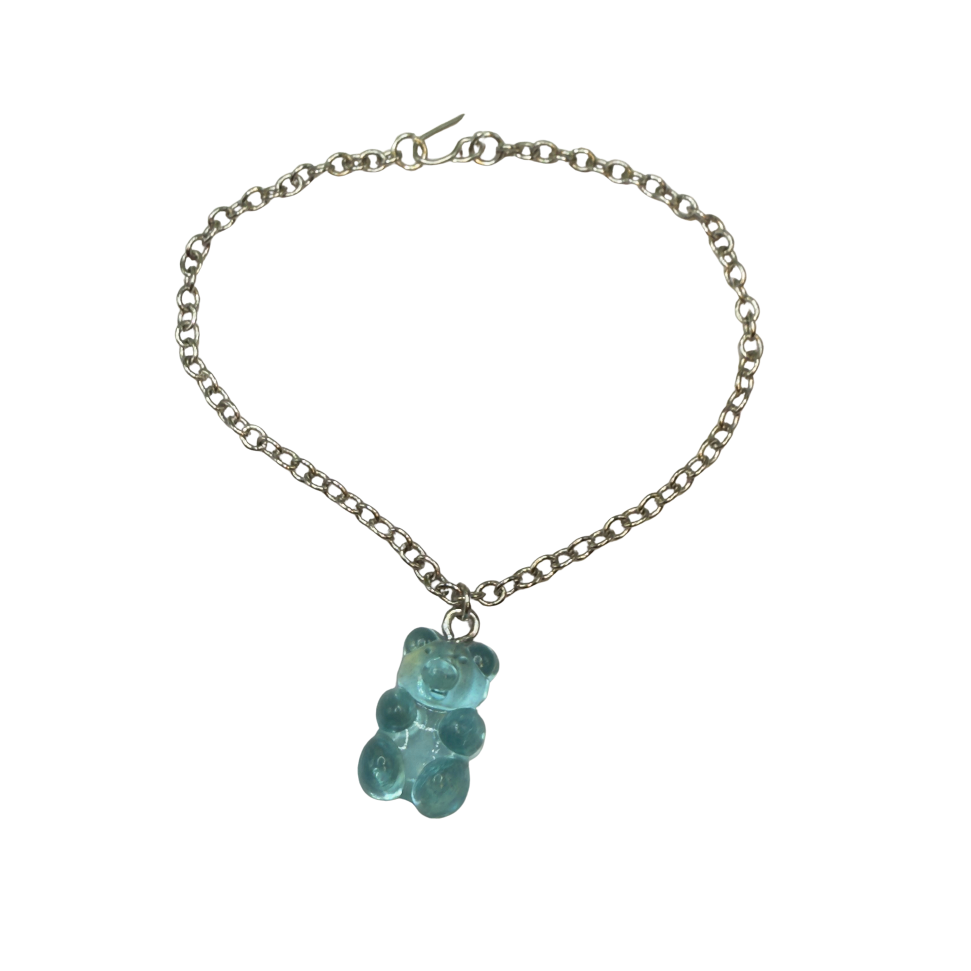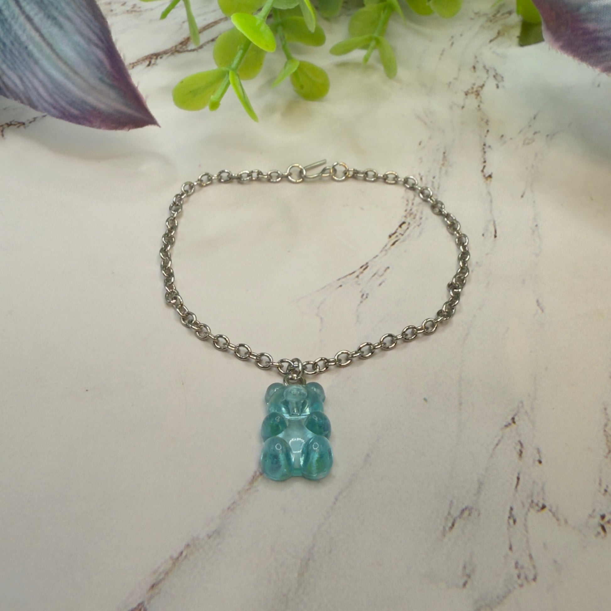 Turquoise Blue Translucent Acrylic Teddy Gummy Bear Charm Silver Chain Doll Necklace. Necklace measures 7 inches long.