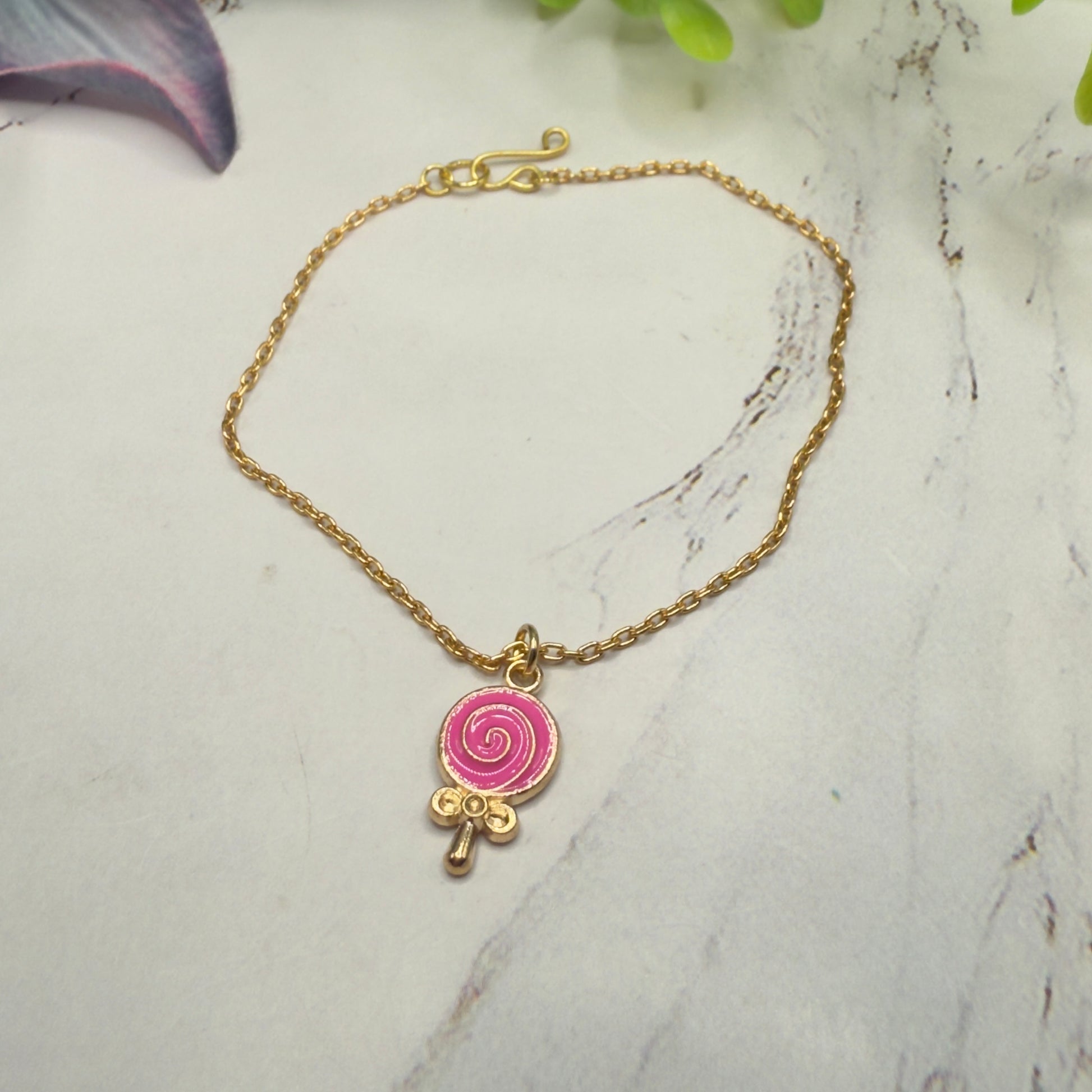 - Materials / details: Gold-tone chain, gold-tone lollipop charms with pink enamel