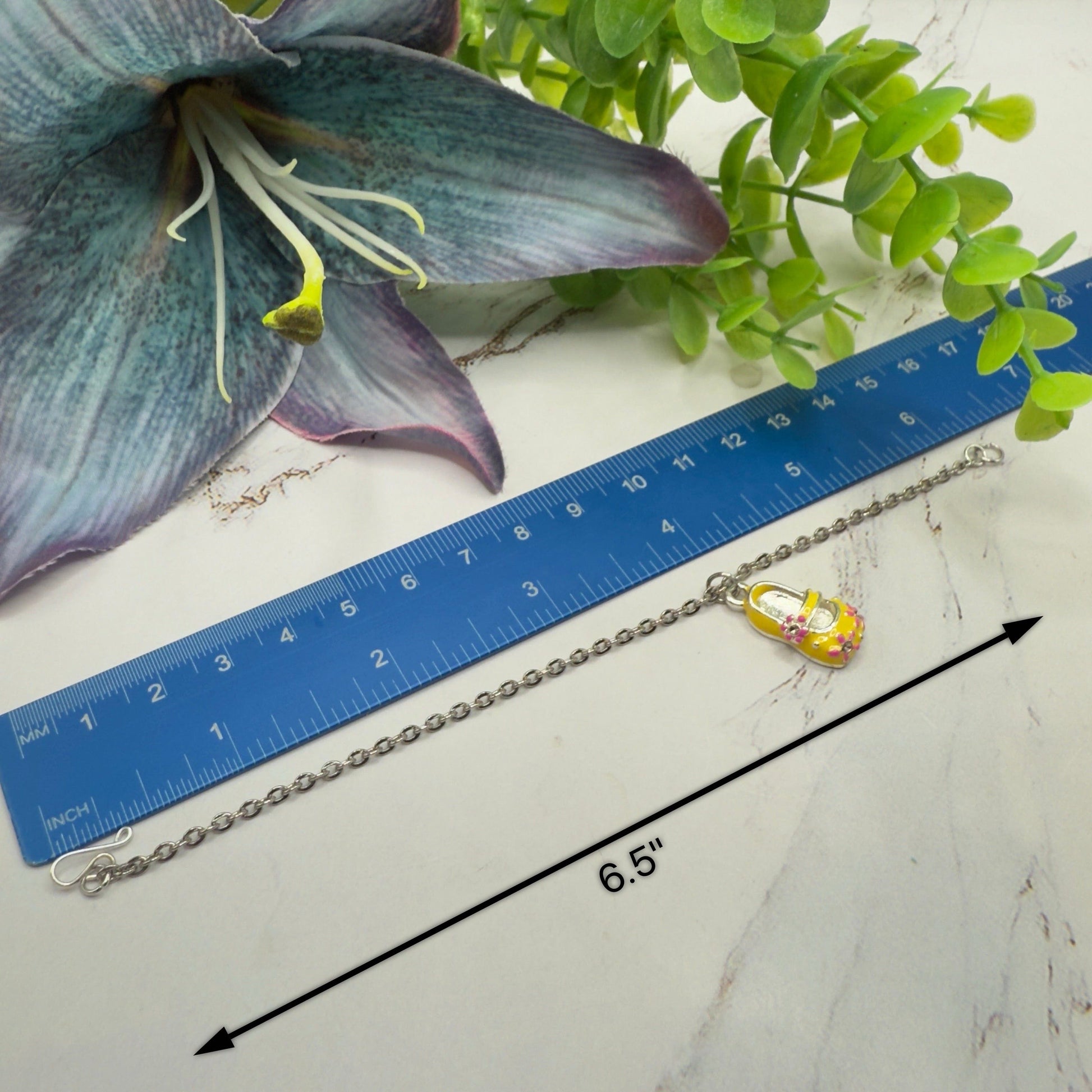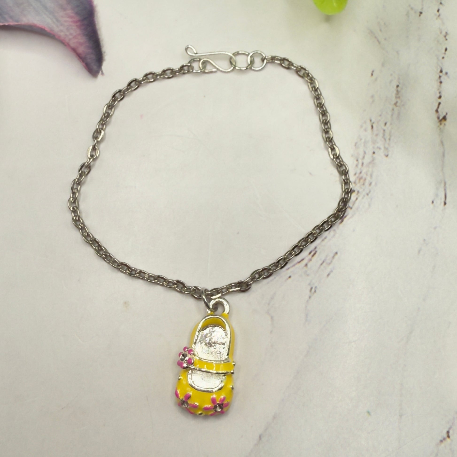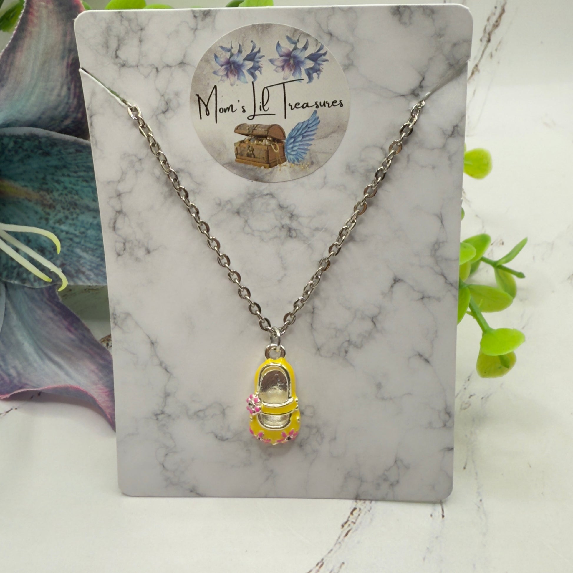 Yellow Marie Jane Shoe Charm w/ Pink Flowers Doll Necklace