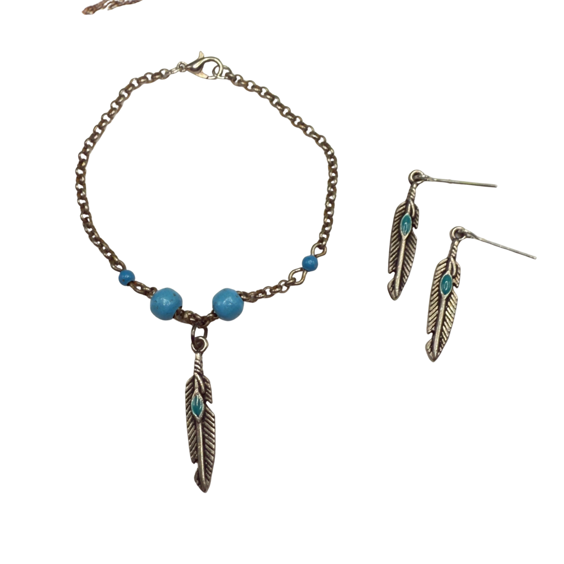 Turquoise Blue Silver Feather Dangle Charm Doll Necklace & Earrings Set