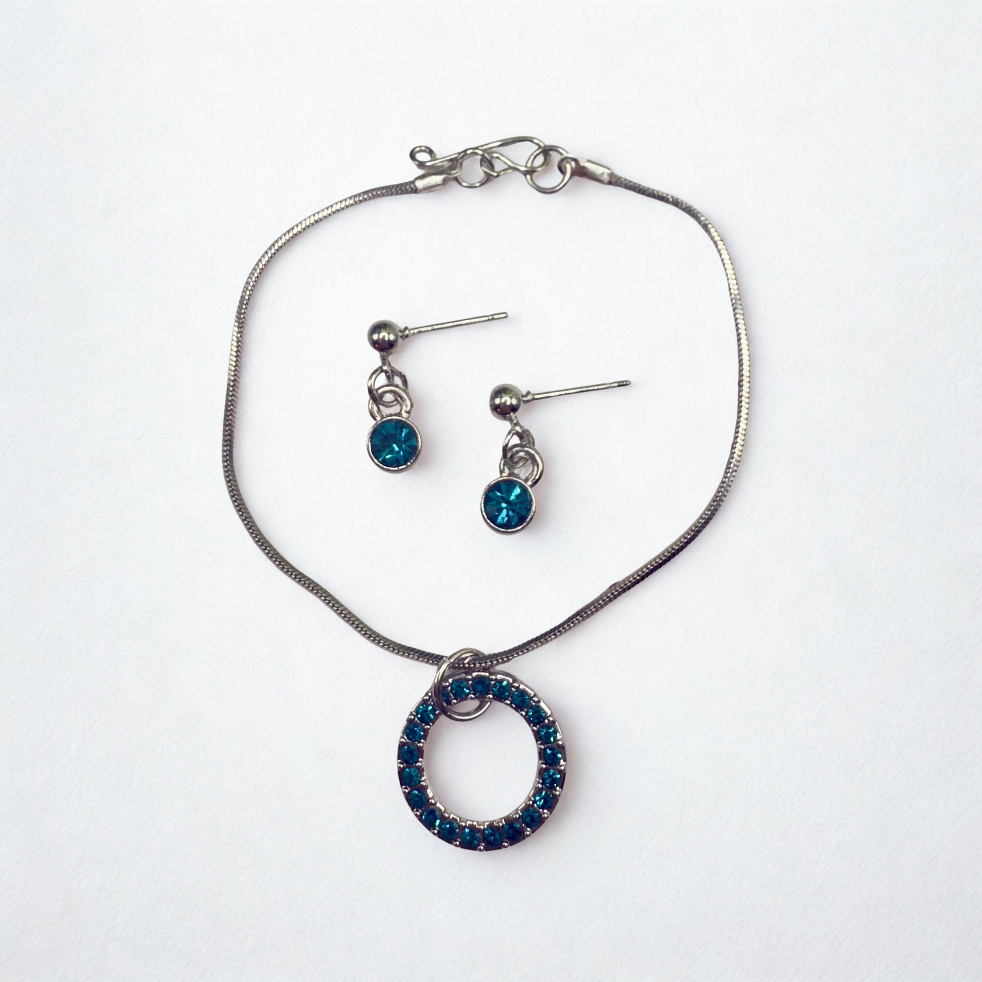 Turquoise Rhinestone Round Pendant Doll Necklace & Earrings Set