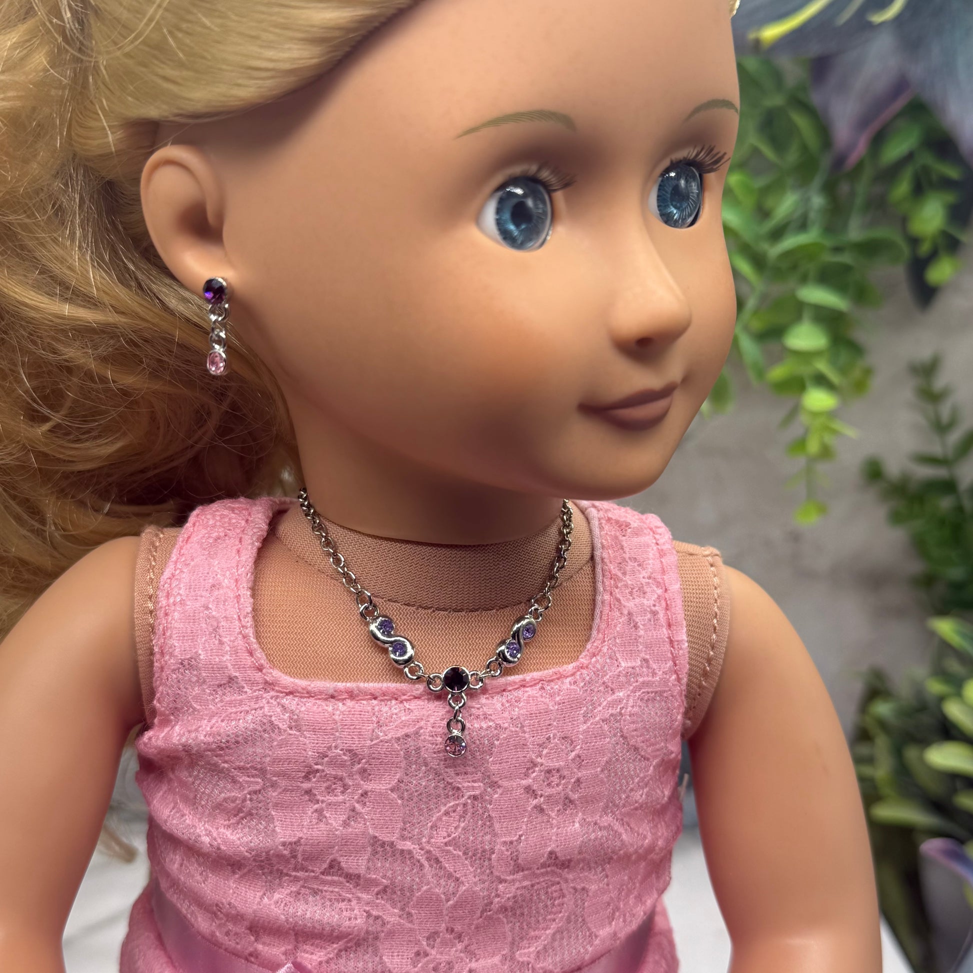 Pink Purple Rhinestone Silver Doll Necklace & Earrings Set • 18 Inch Fashion Doll Jewelry