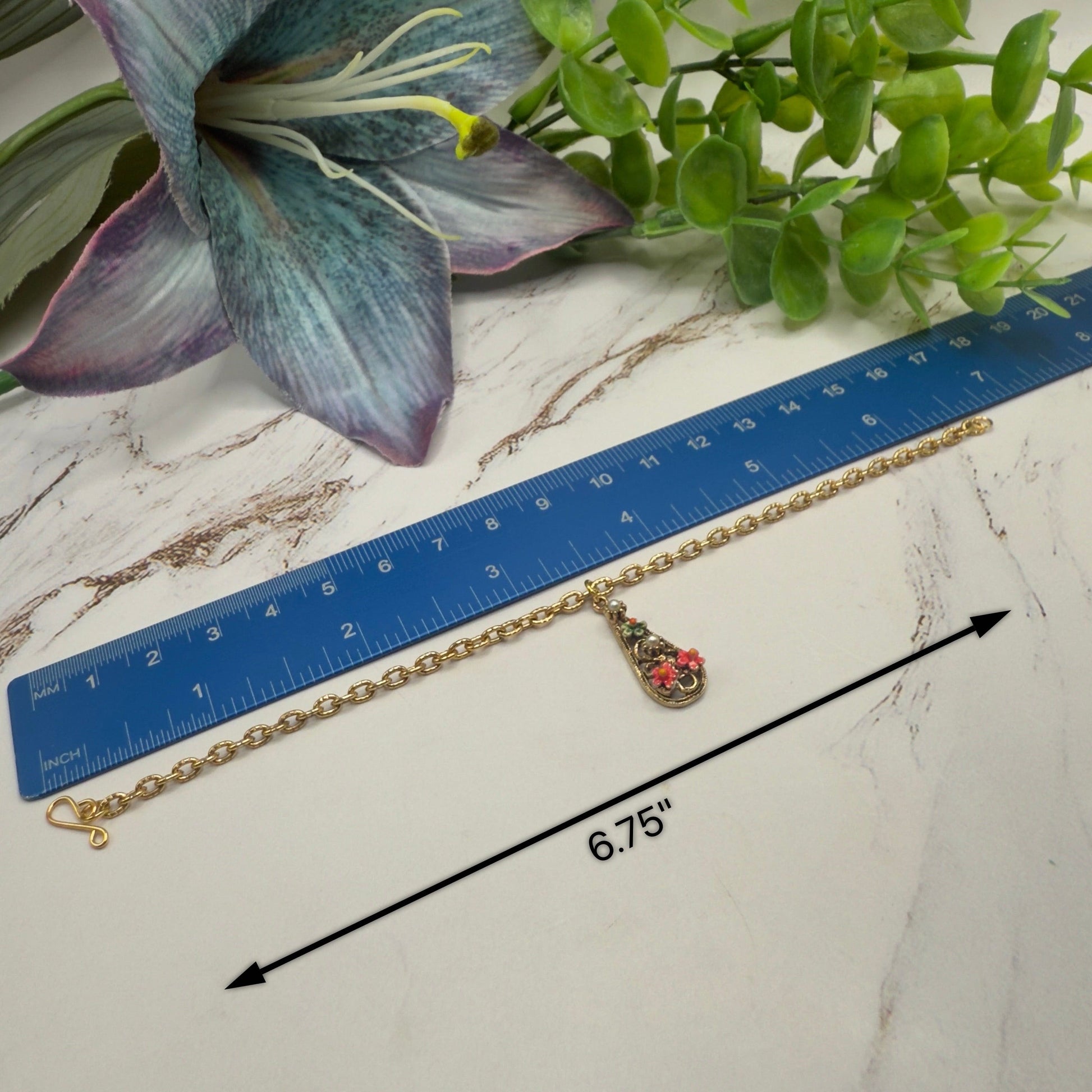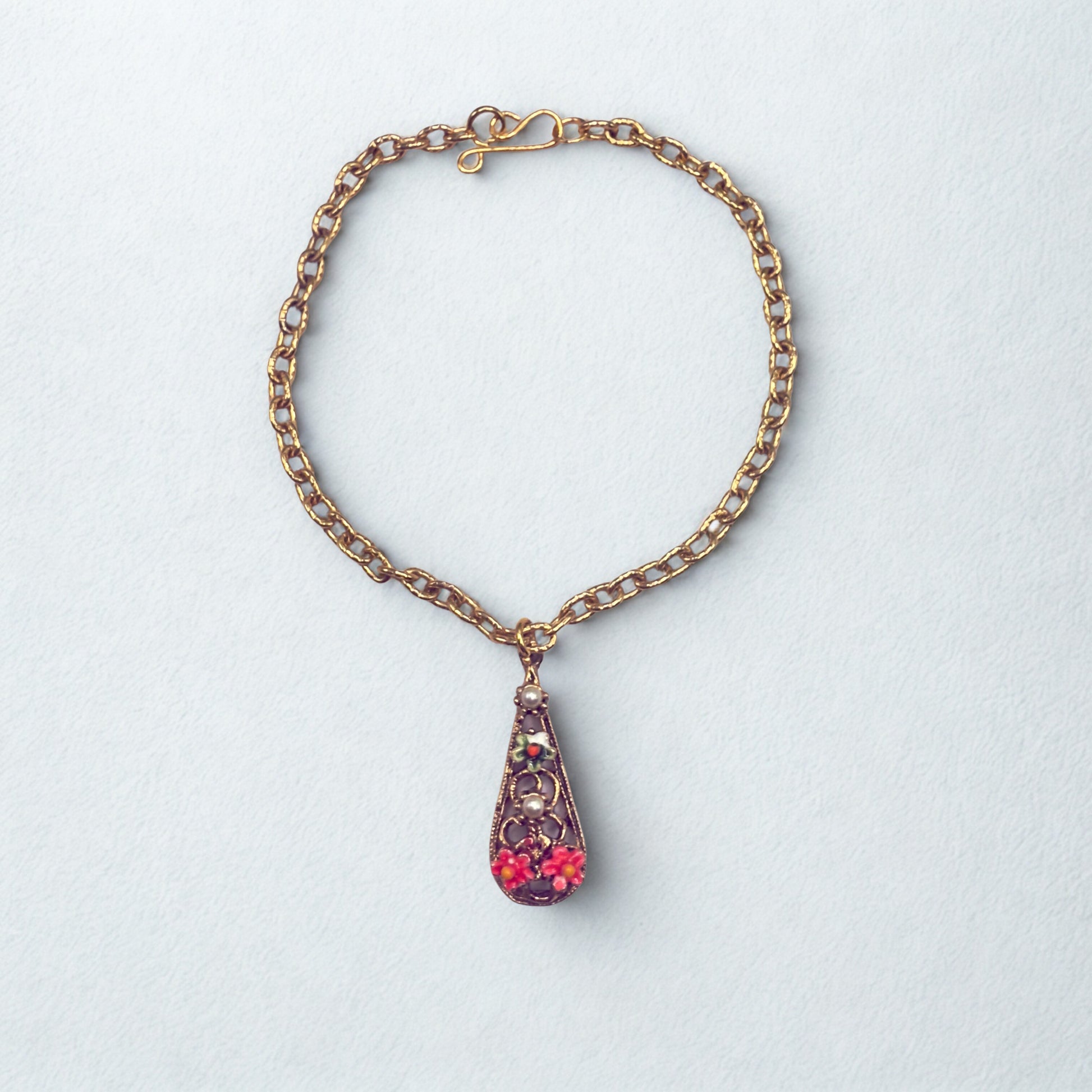 - Materials / details: gold-tone chain, teardrop shaped filigree design pendant with enamel coating floral design and tiny faux pearl accents