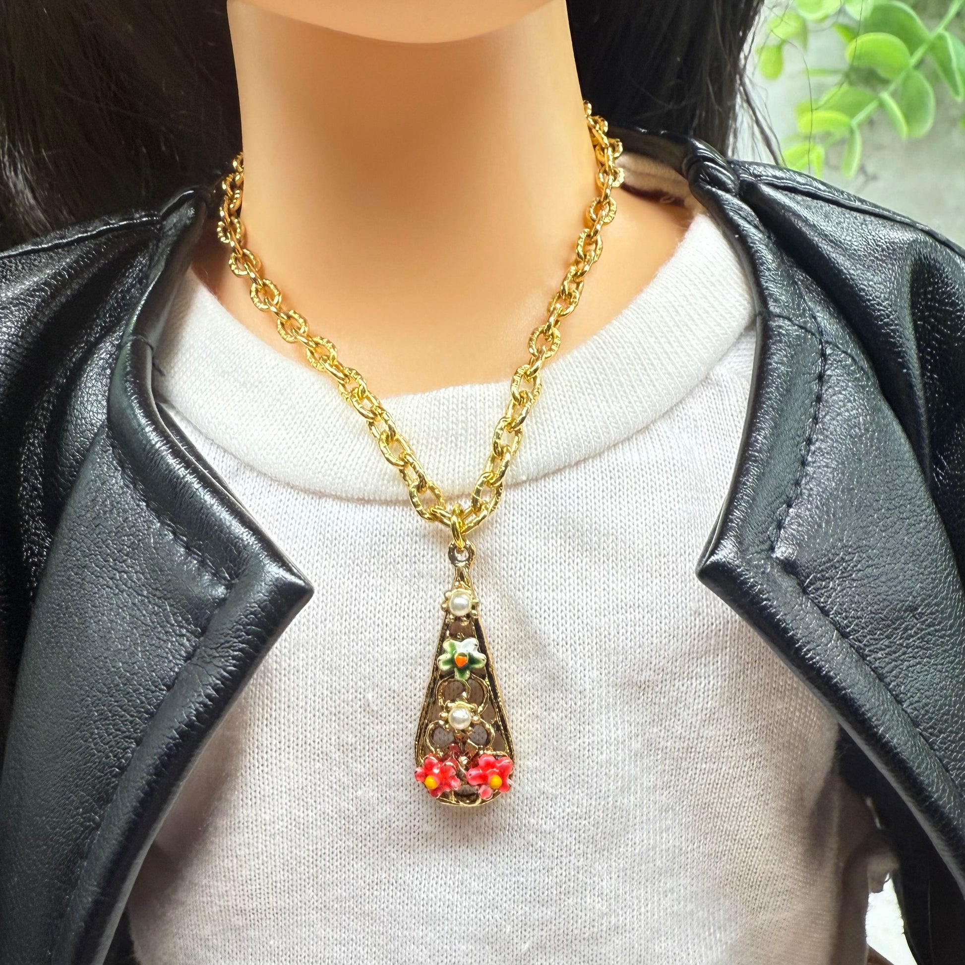 Teardrop Charm Floral Design Gold Chain Doll Necklace • 18 Inch Fashion Doll Jewelry