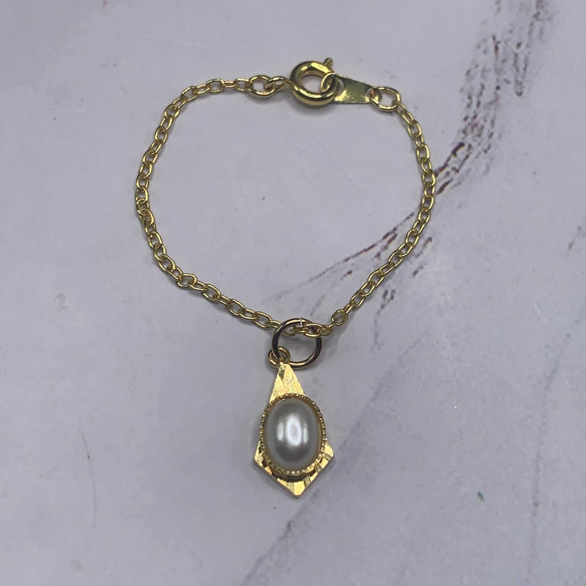 Faux Pearl Cabochon Gold tone Pendant on Gold Tone Chain Doll Necklace. Necklace measures 4.25 inches long.