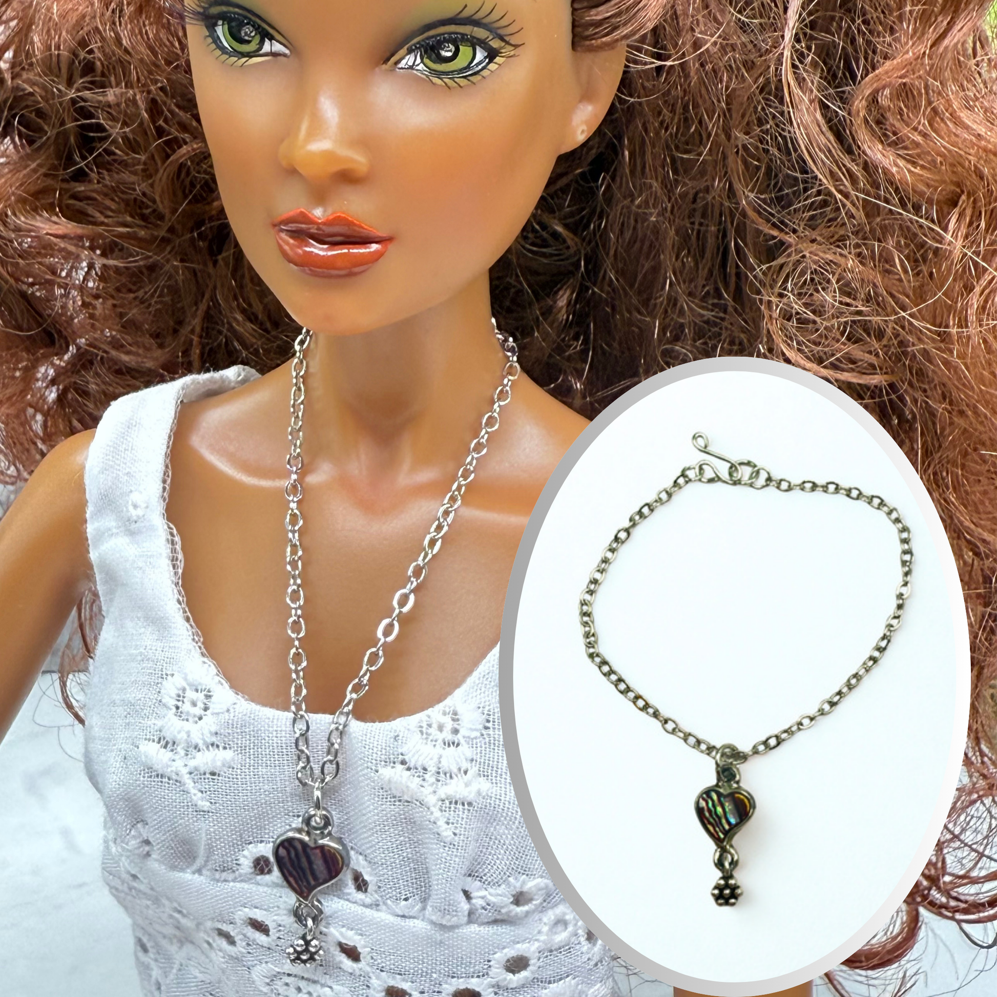 Silver & Green Tones Abalone Heart Doll Necklace • 16 Inch Fashion Doll Jewelry