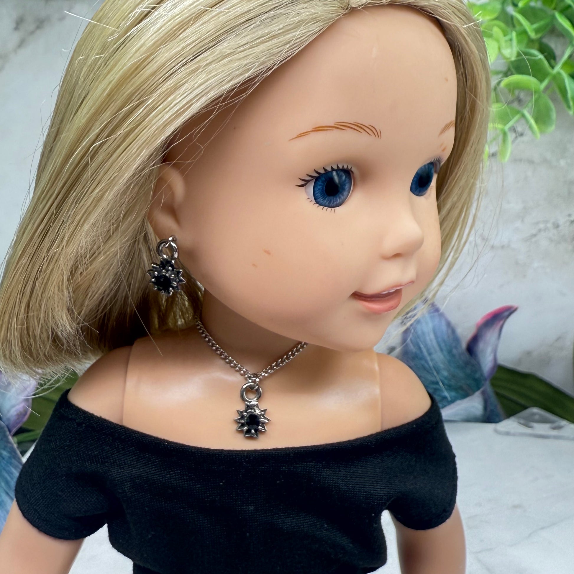 Black Rhinestone Flower Charm Silver Chain Doll Necklace & Earrings Set • 14 Inch Fashion Doll Jewelry