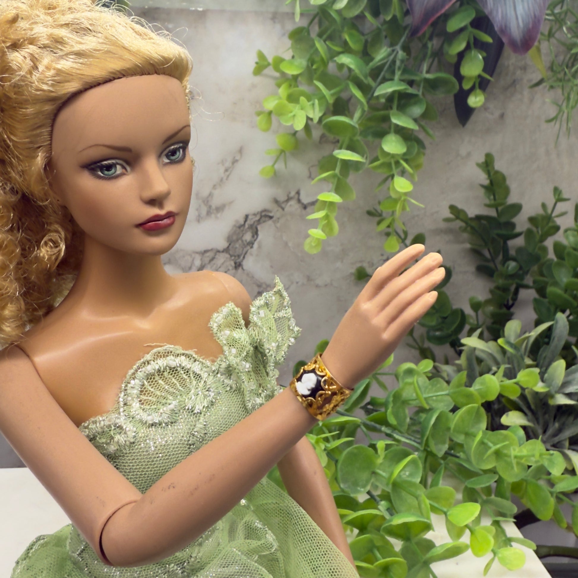 Black & White Cameo Gold Filigree Cuff Doll Bracelet • 16” Fashion Doll Jewelry