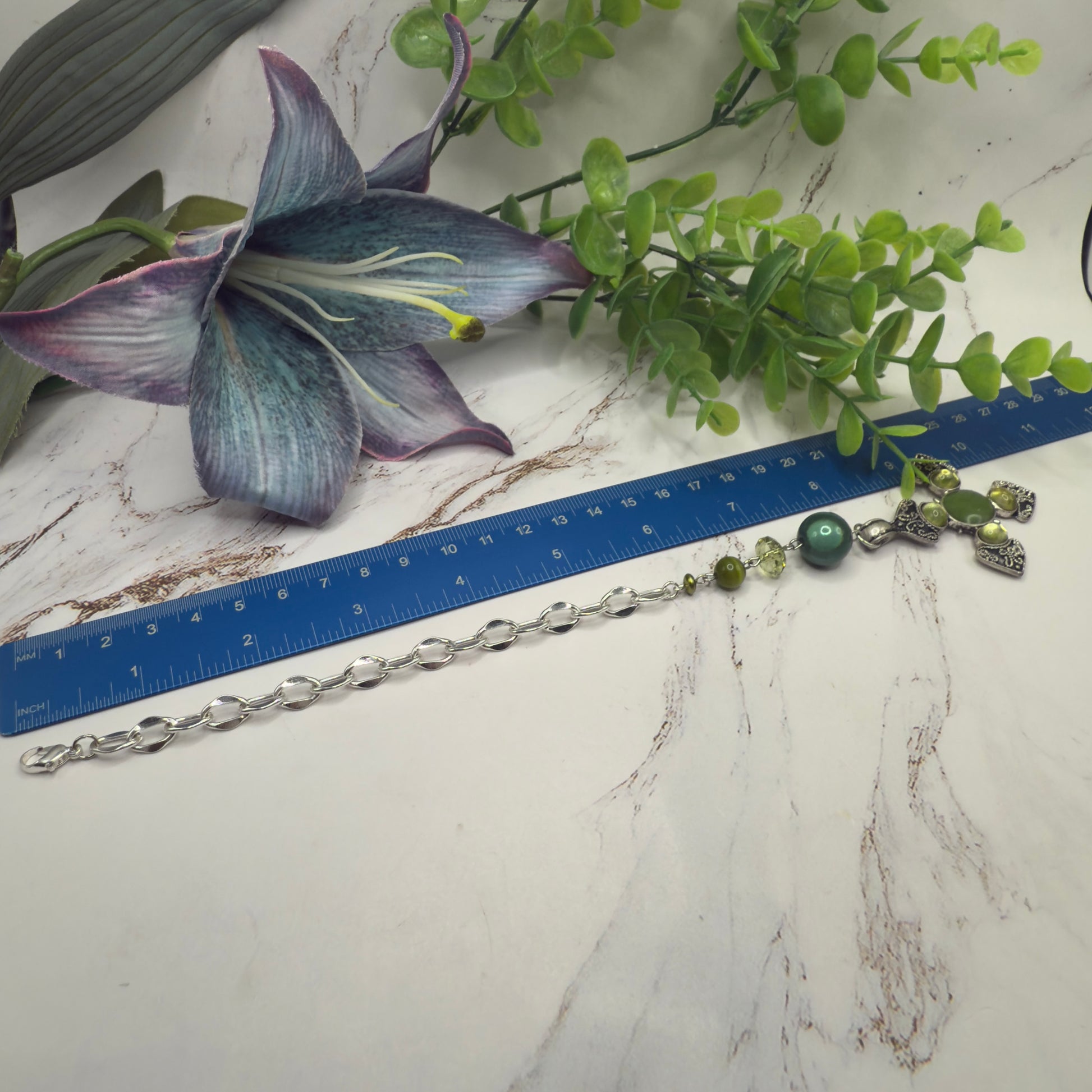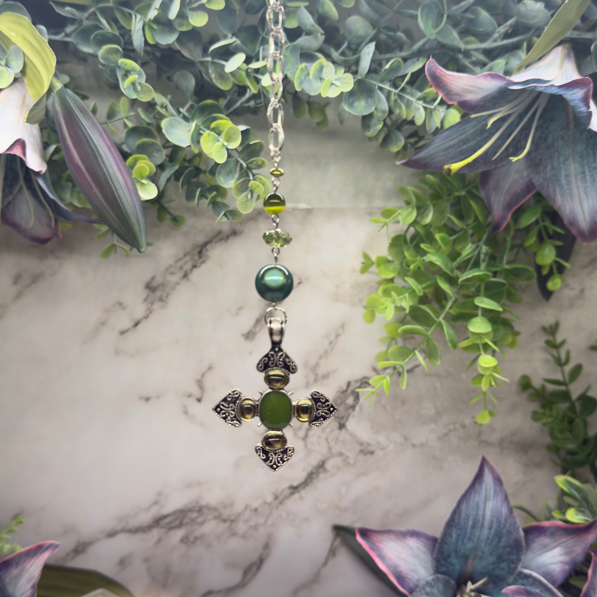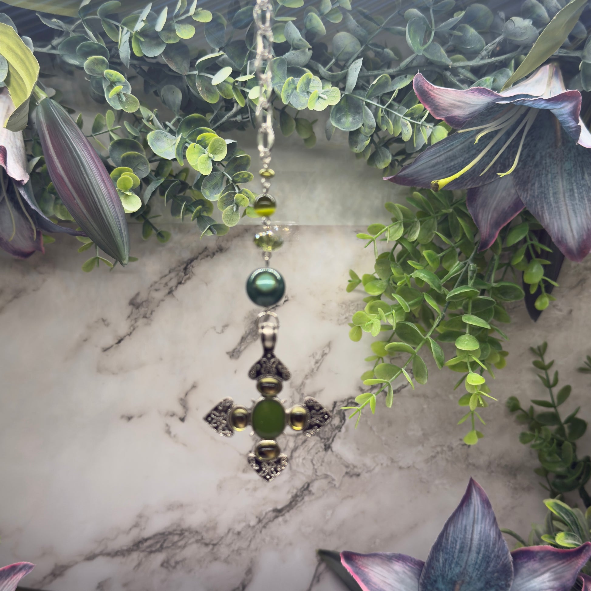 Green Cabochon Silver Cross & Green Bead Chain • Car Mirror Charm / Sun Catcher