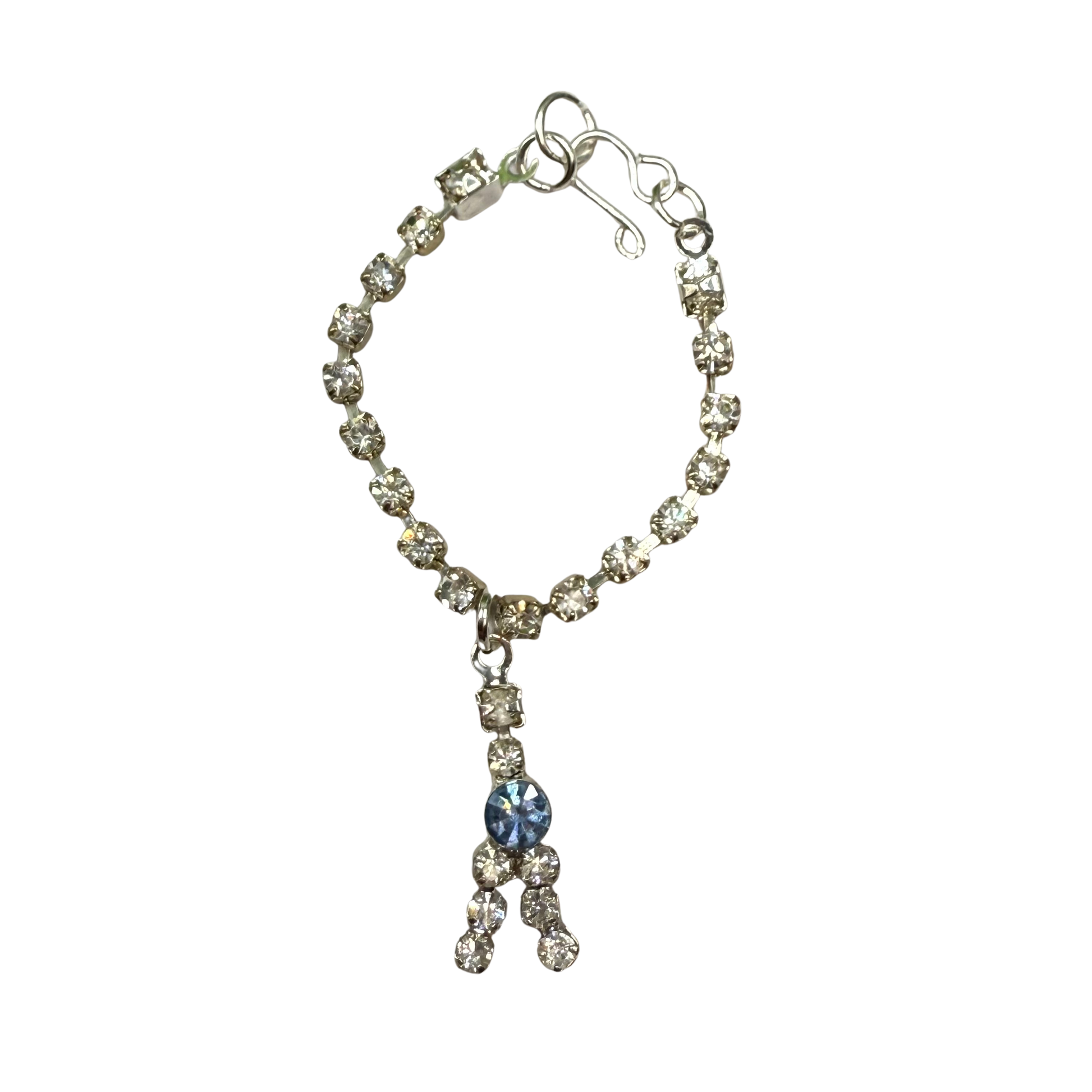 Clear & Blue Rhinestone Y-Drop Doll Necklace . The necklace is 3-3/8 inches long.