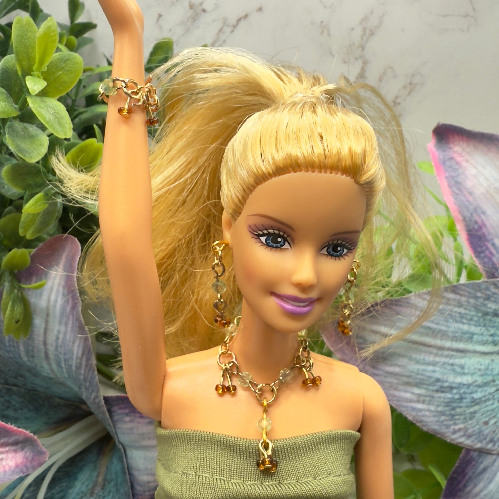 Elevate your fashion doll's look with this Green Brown Glass Dangle Doll Necklace Earrings Bracelet Set. The set includes a matching 2-1/8”necklace, earrings, and bracelet. Bracelet measures 1-1/8 inches long.
