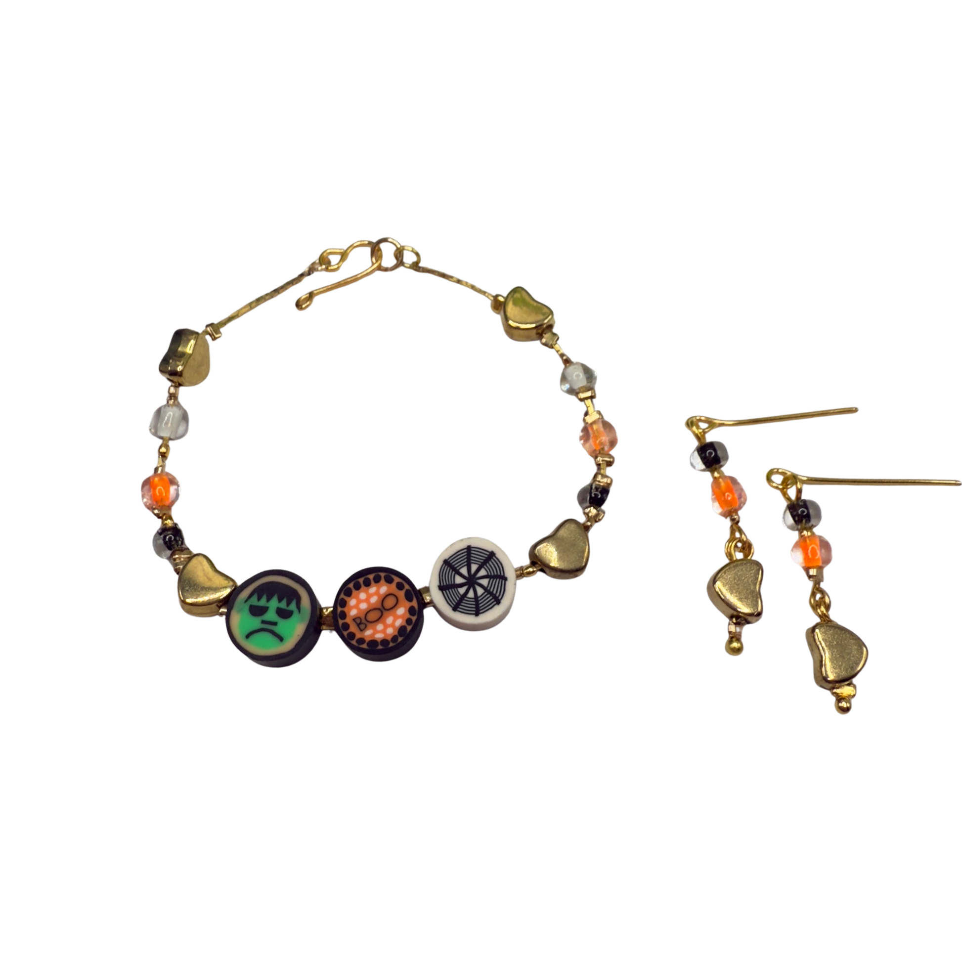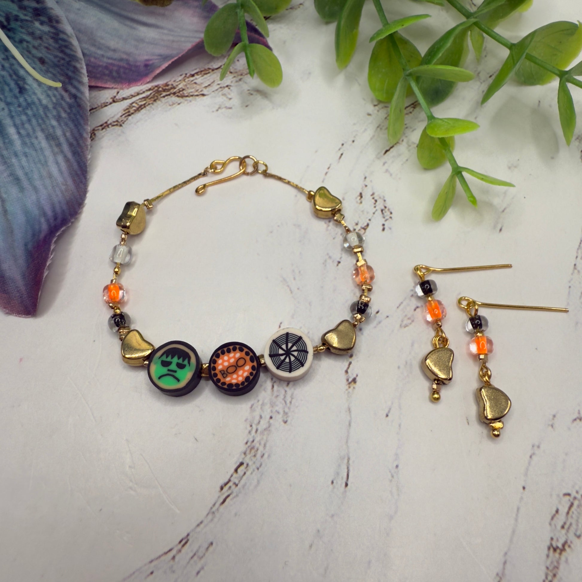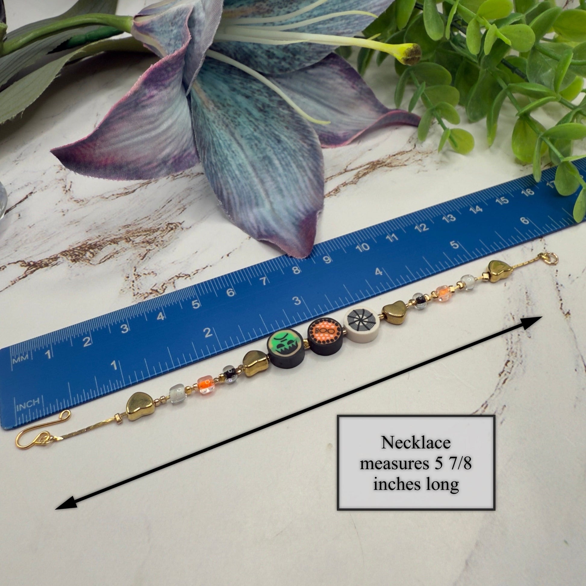 Halloween Boo Spider Web Frankenstein Acrylic Silicone Beaded Doll Necklace and Earrings Set. Necklace measures 5 7/8 inches long.