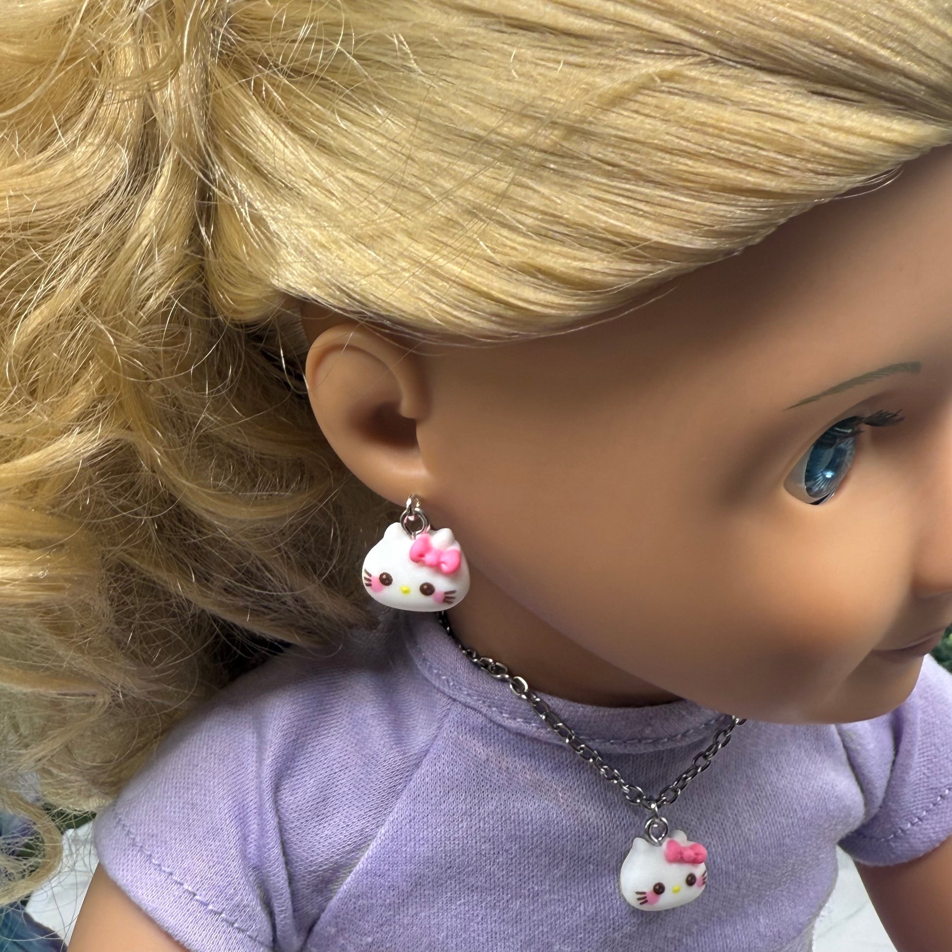 Hello Cat Pink Bow Kitty Charm Doll Necklace and Earrings Set • 18 Inch Fashion Doll Jewelry