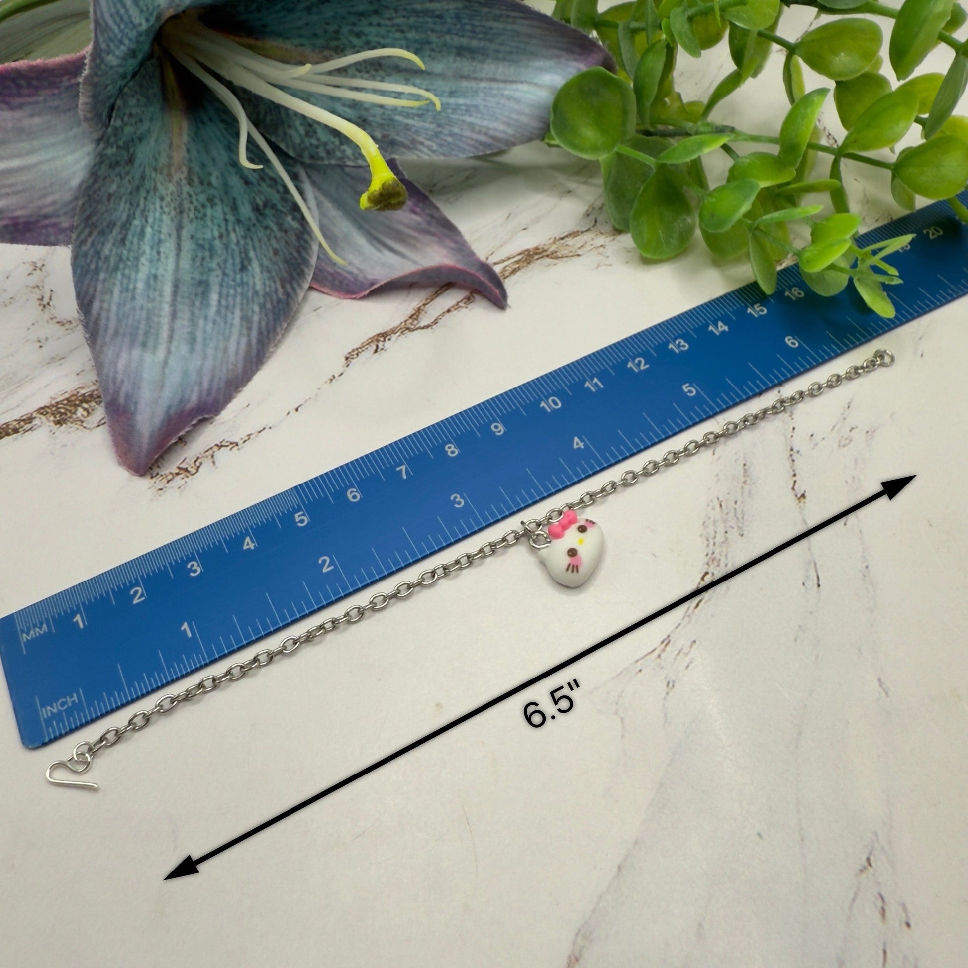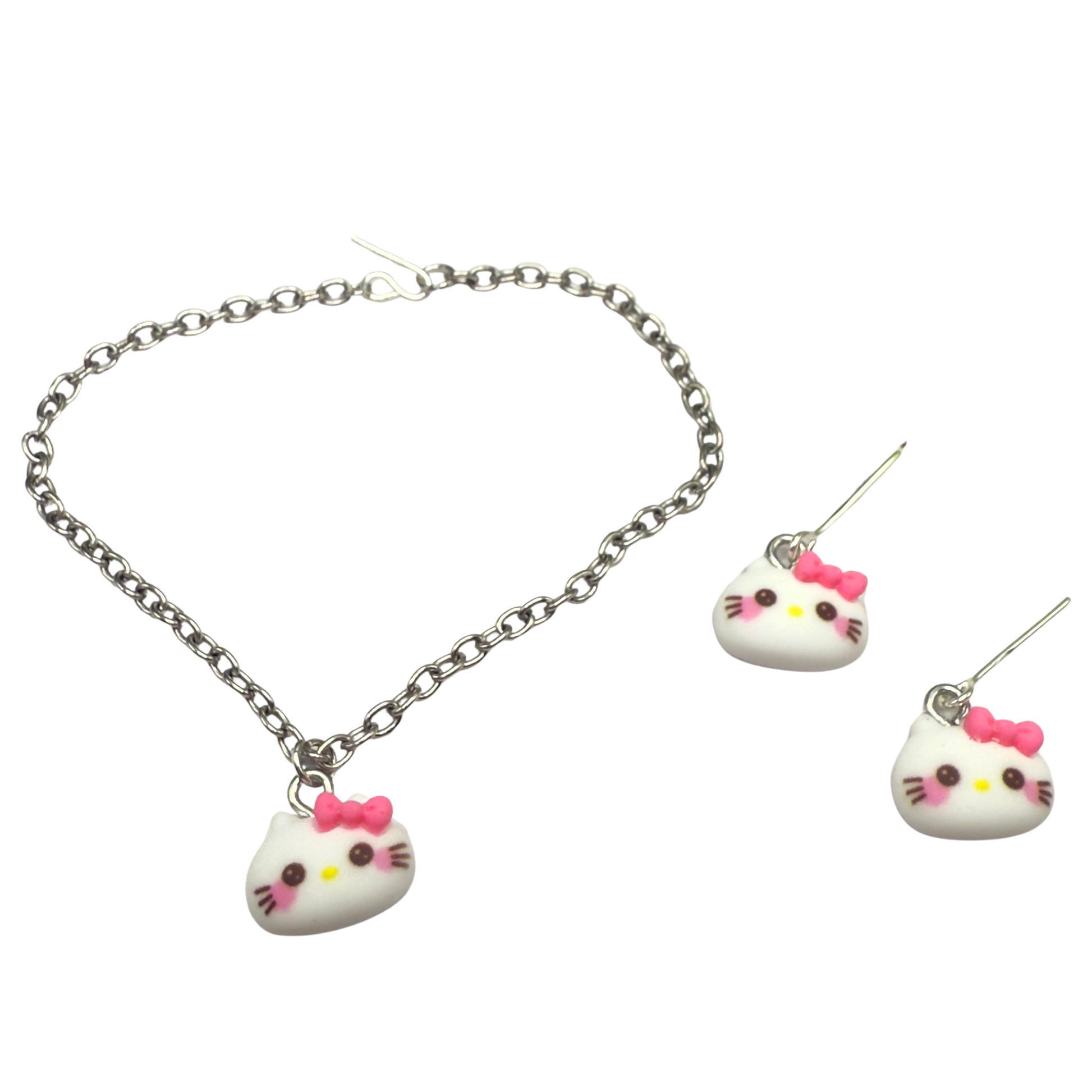 Hello Cat Pink Bow Kitty Acrylic Charm Doll Necklace and Earrings Set. Necklace measures 6.5 inches long.