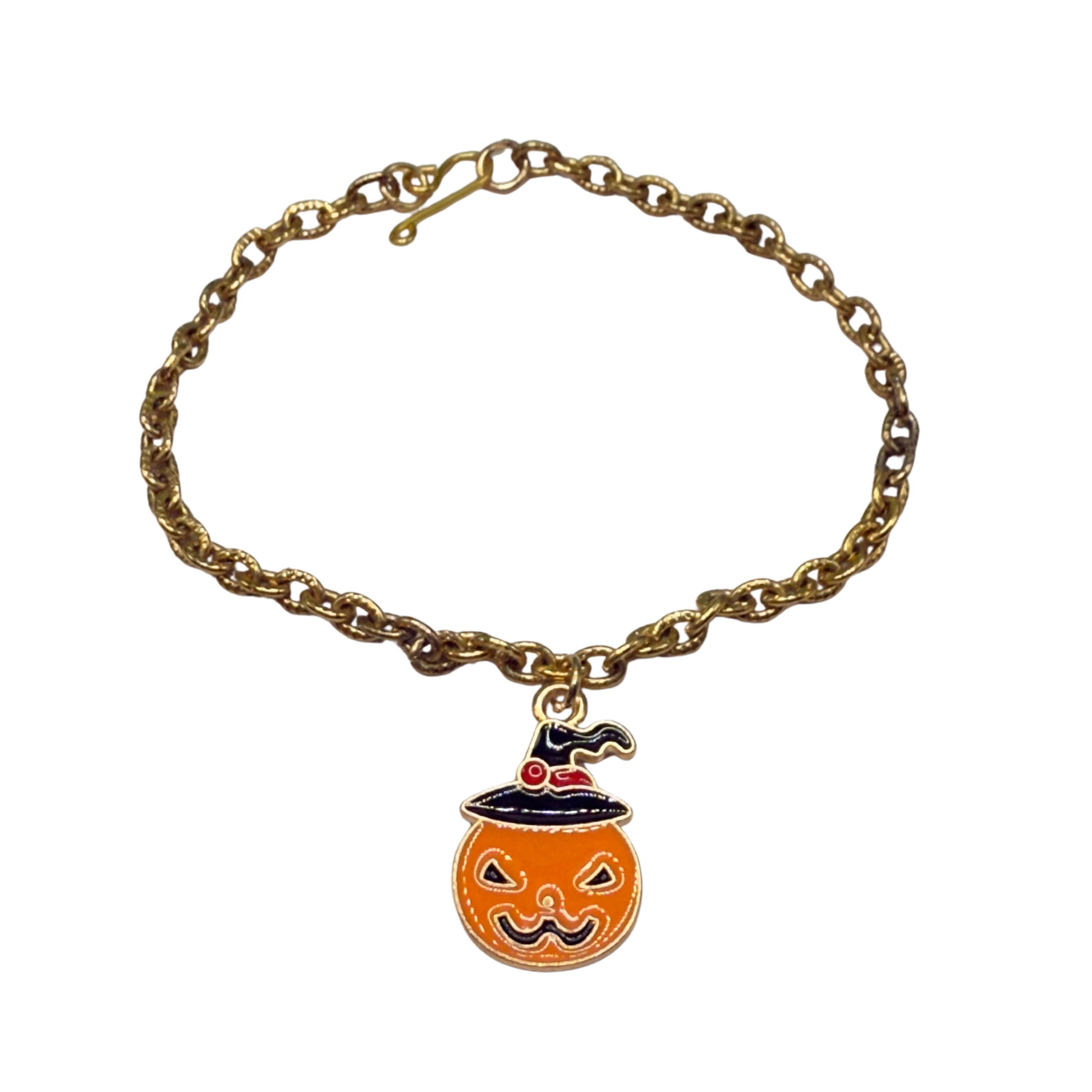 Jack-O-Lantern Halloween Pumpkin Charm Gold Chain Doll Necklace. Necklace chain measures 6.5 inches long.