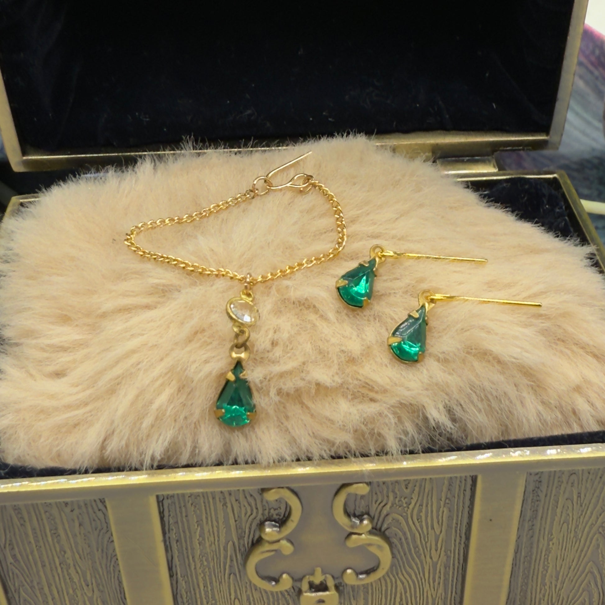 Green Rhinestone Teardrop Gold Doll Necklace Earring Set • 16 Inch Doll Jewelry