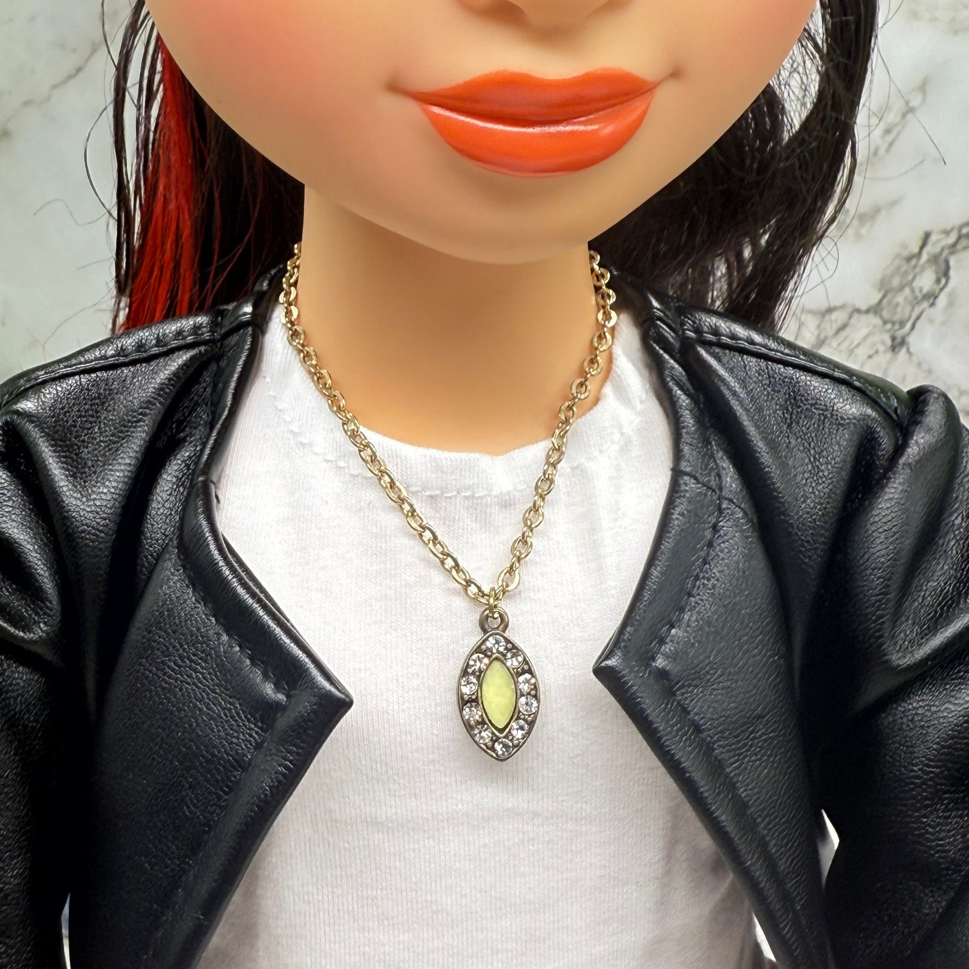 Oval Light Green Clear Rhinestone Pendant Gold Doll Necklace • 18 Inch Fashion Doll Jewelry