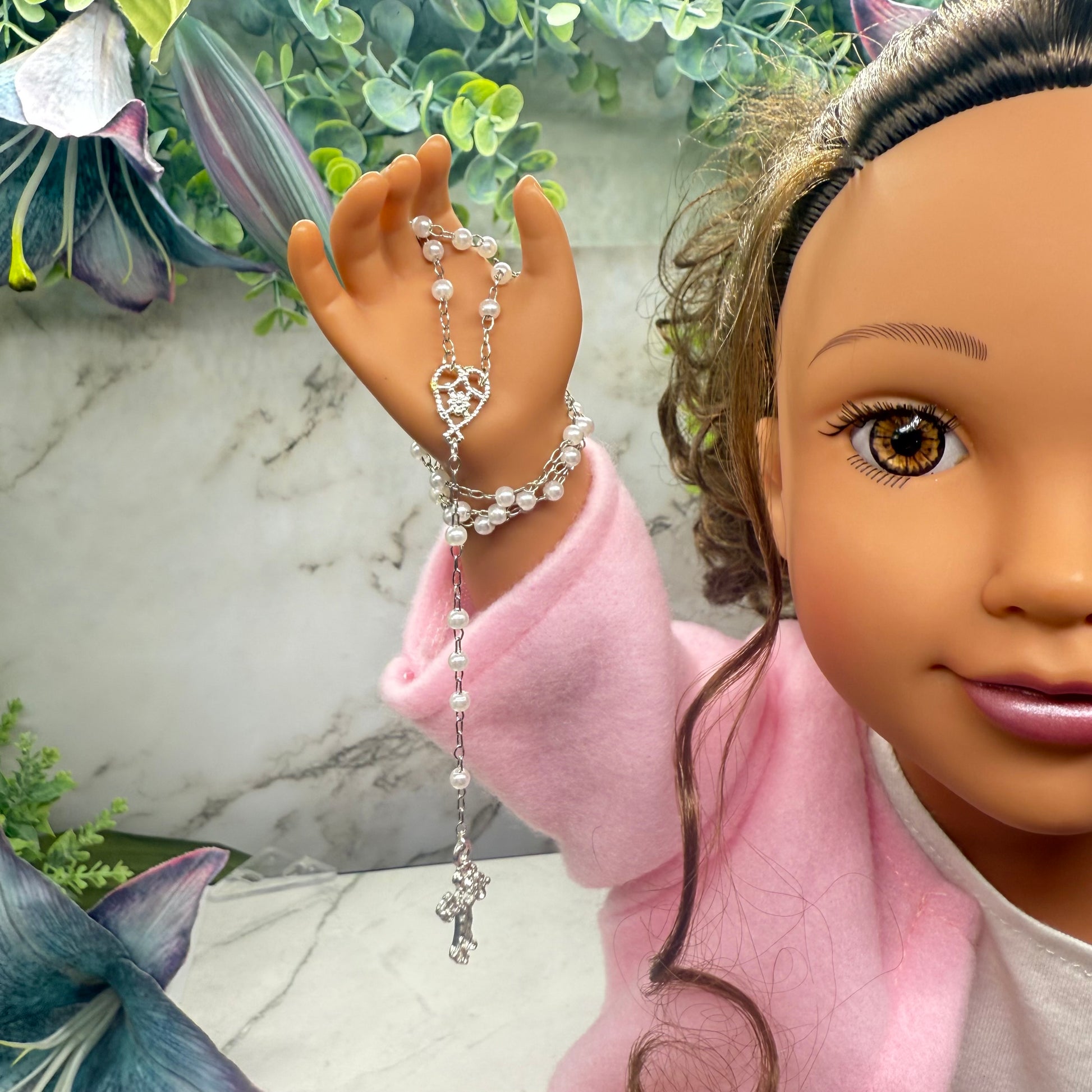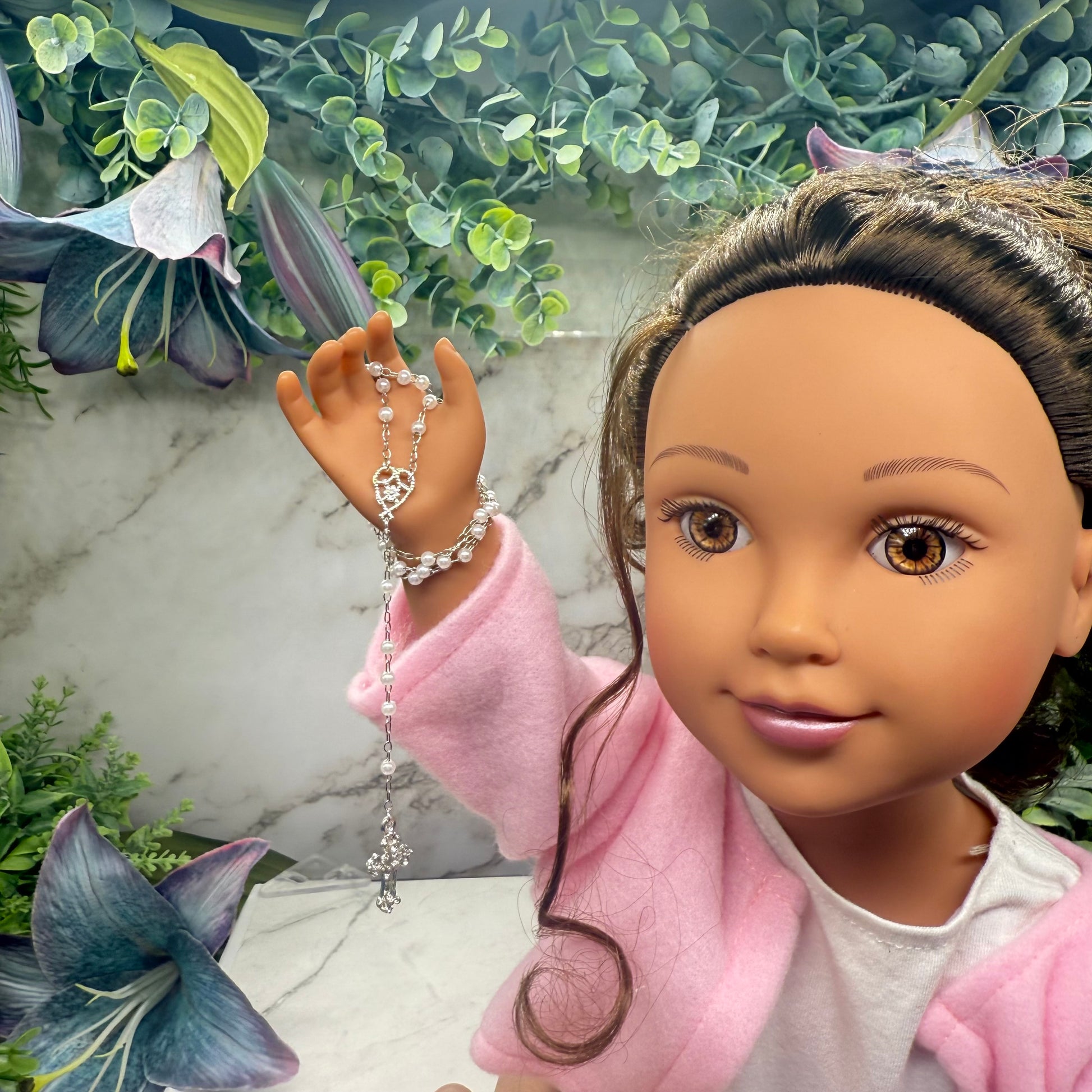 Pearl Beaded Silver Cross • Doll Size Catholic Rosary for 18-22” Fashion or Vintage Dolls