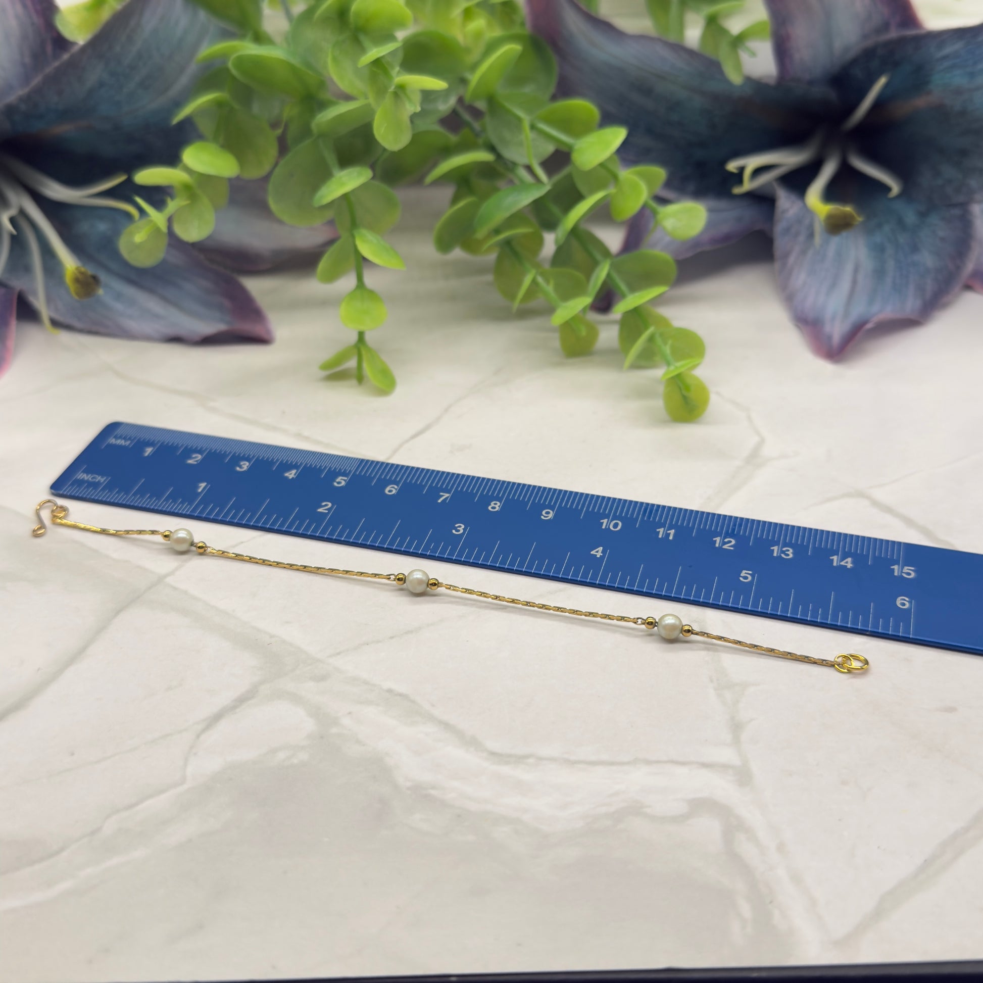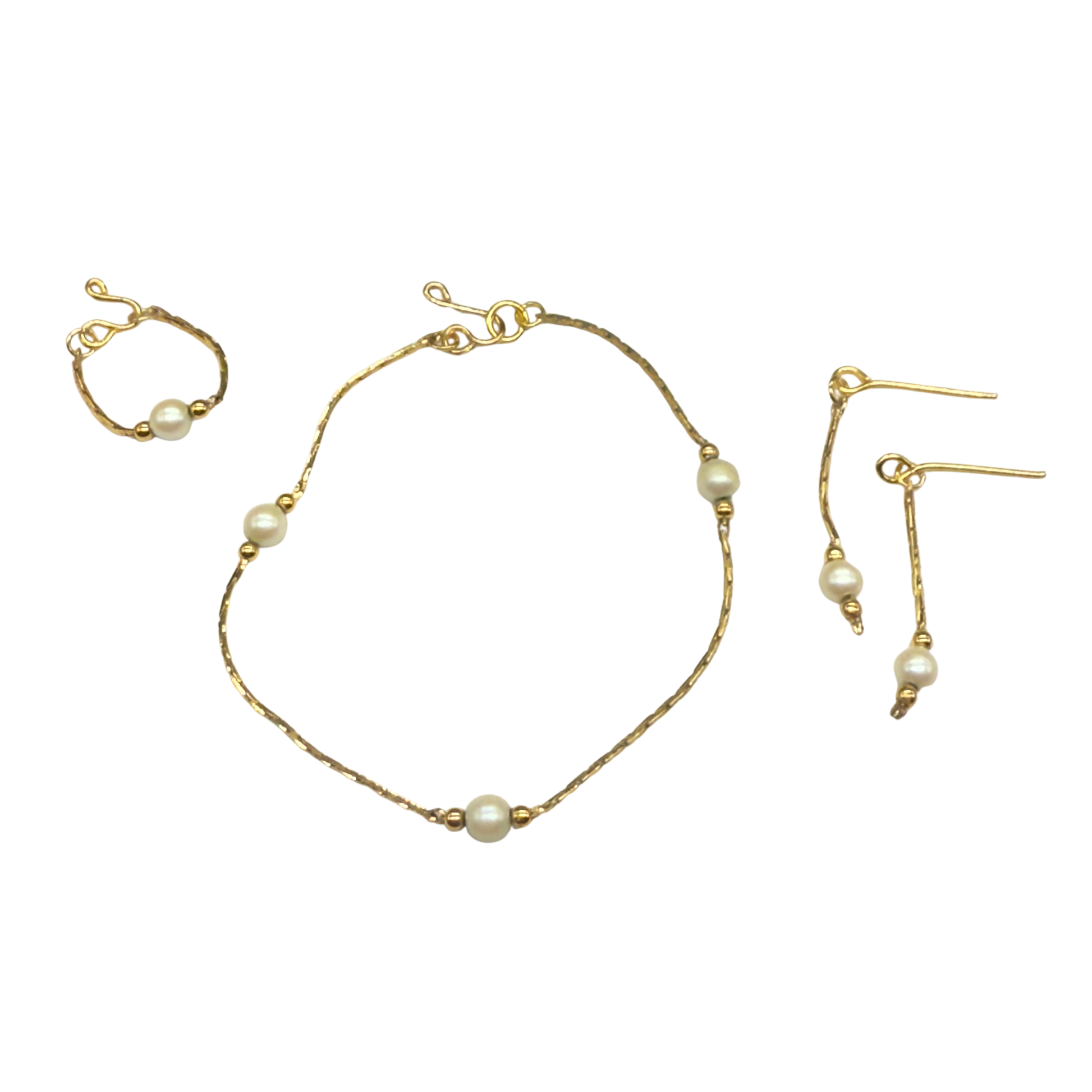 Pearl Gold Serpentine Chain Doll Necklace Earring Bracelet Set. The necklace measures 5.75 inches long. Bracelet is 1 - 5/8” long.