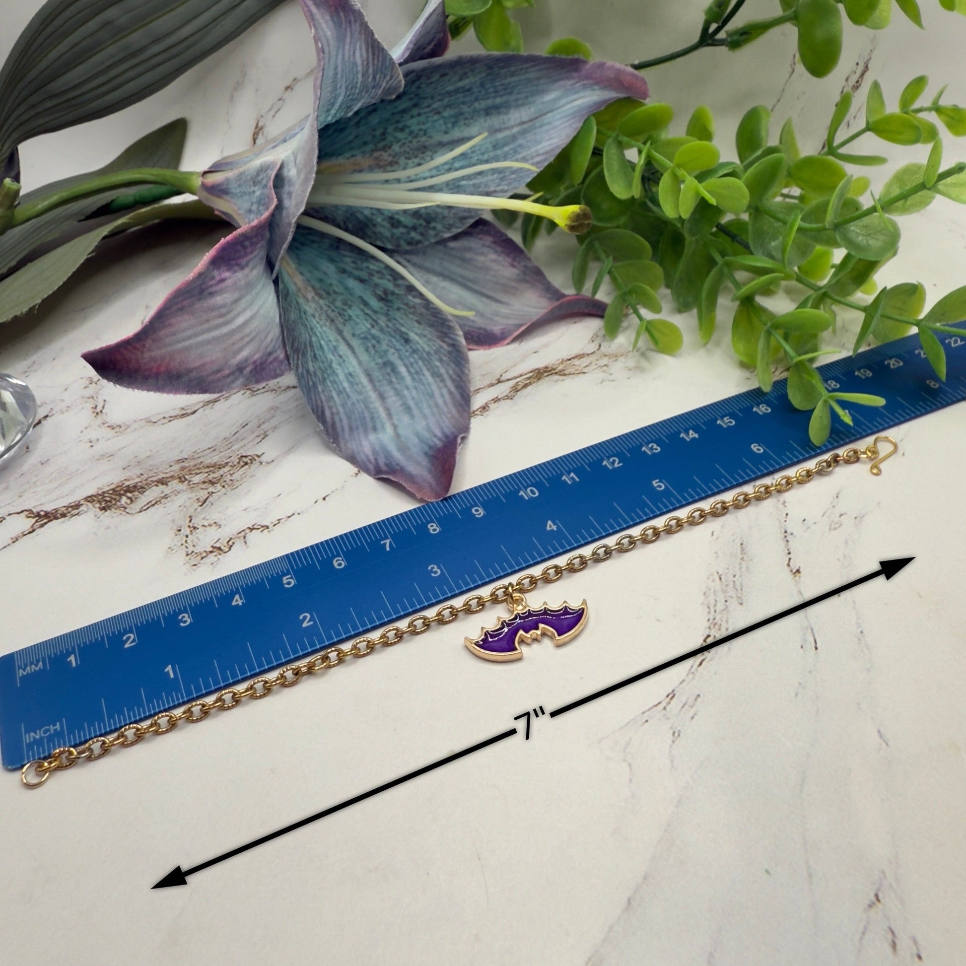 Purple Enamel Metal Bat Charm Halloween Doll Necklace. Necklace chain measures 7 inches long.