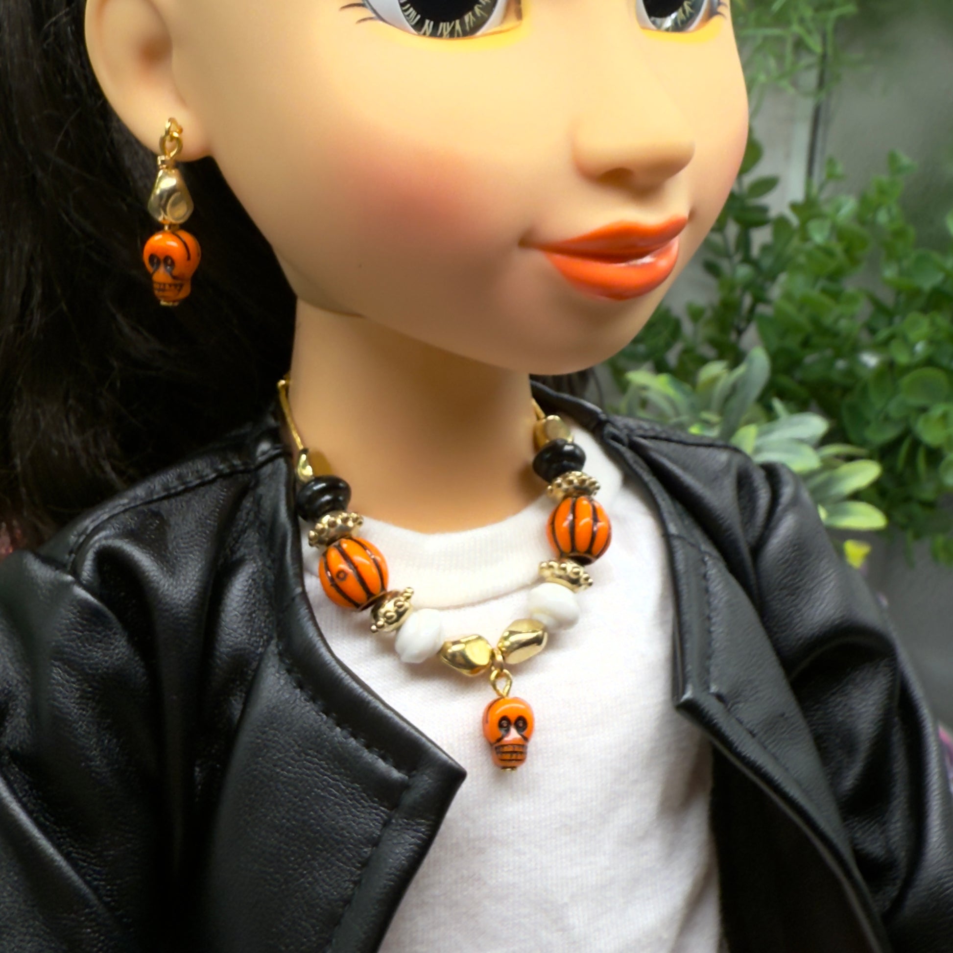 Skull Charm Halloween Acrylic Slide Bead Gold Chain Doll Necklace and Earrings Set • 18 Inch Fashion Doll Jewelry