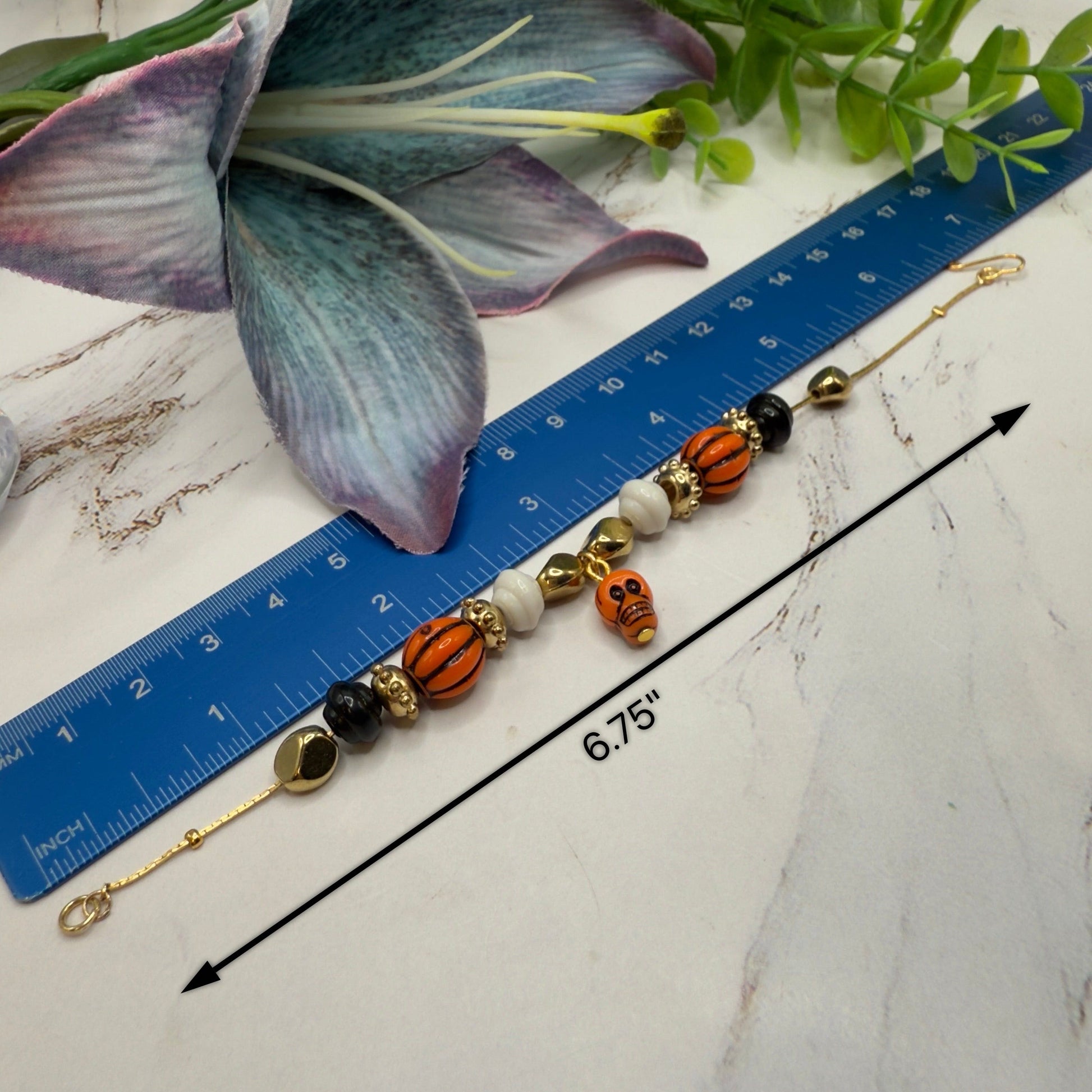 Skull Charm Halloween Acrylic Slide Beads on Gold tone serpentine Chain Doll Necklace and matching Earrings Set. Necklace measures 6 3/4 inches long.