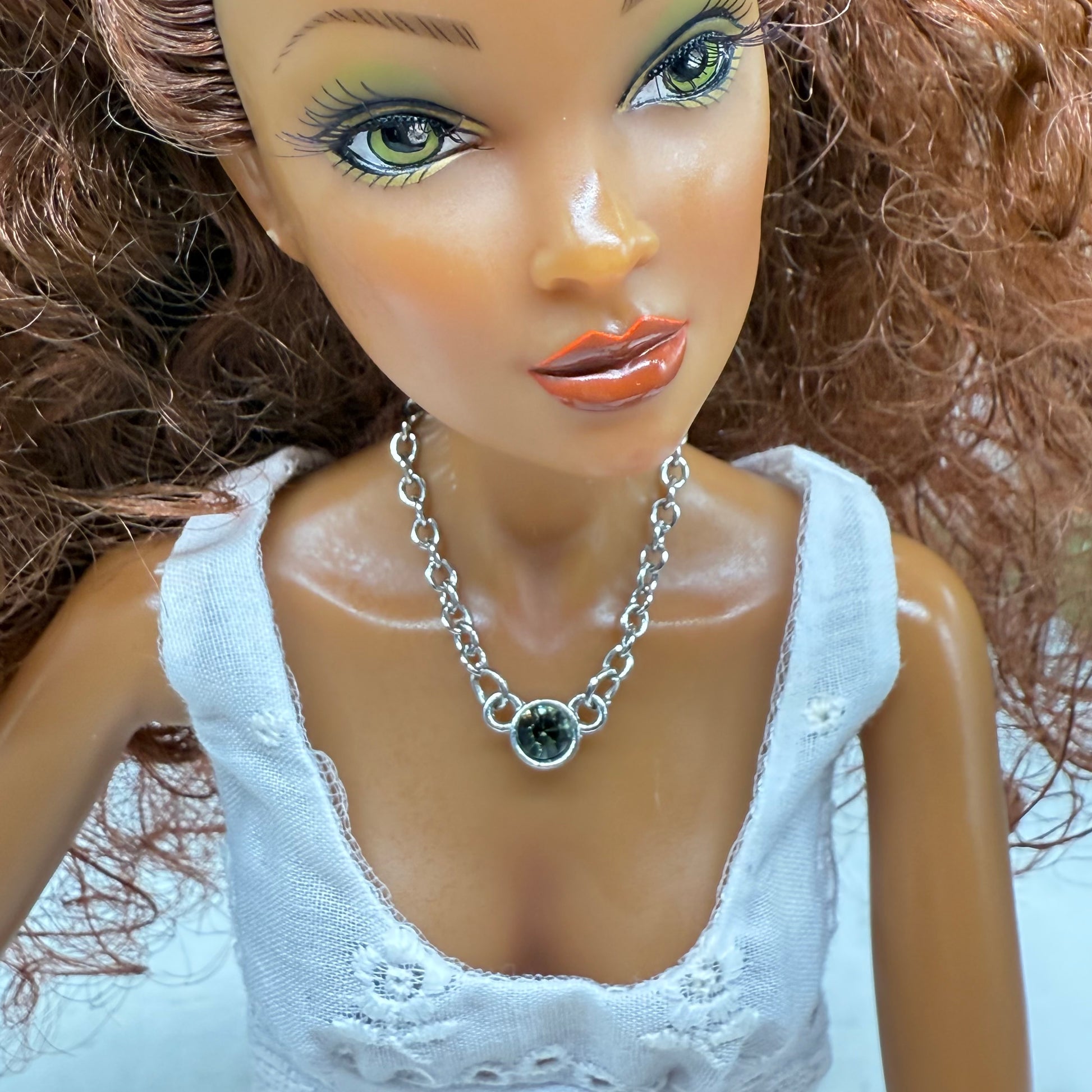 Smoky Green Round Crystal Pendant Silver Doll Necklace • 16 Inch Fashion Doll Jewelry